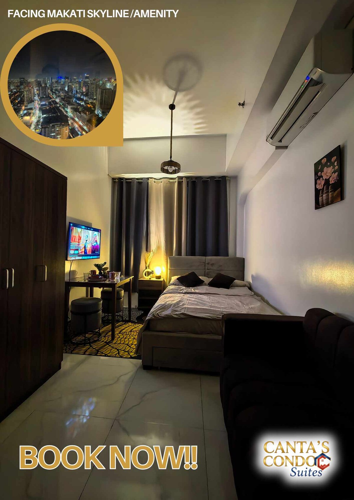 Əlverişli əlçatandır və Makati biznes rayonunun mərkəzində, ticarət mərkəzi,klublar, restoranlar, xəstəxanalar, hava limanı,kilsə və məktəbin yanında yerləşən bu mərkəzdən zövq alın. Bu kondominium/studiya növü google tv,pulsuz Netflix, hamam və tualet, kondisioner, mətbəx şəbəkəsi,çox sürətli Wi-Fi və yemək masası ilə təchiz olunub. Kraliça ölçüsü və qatlanan çarpayı. Giriş saat15:00 -dan sonra istənilən vaxtdır Çıxış saat12:00 -dan gec deyil Mövcud olarsa, erkən giriş sorğusu göndərə bilərsiniz (nəzərə alın: dəyişdirilə bilər)