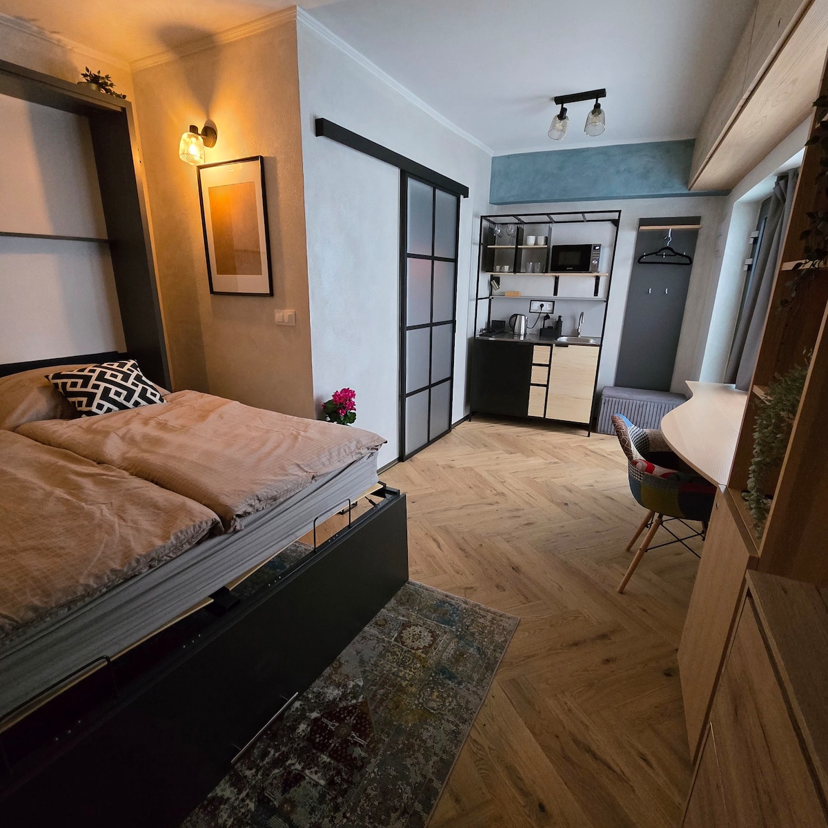 Bir otaqlı mənzil bir çox restoran, klub və Bratislavanın görməli yerlərindən (məsələn, Əsas Meydan, Tarixi Opera Teatrı, Köhnə Şəhər Zalı) piyada məsafədədir. Yaxınlıqdakı ictimai nəqliyyat stansiyalarından şəhər ətrafına asan giriş. Qab-qacaq və əsas qab-qacaqla tam təchiz olunmuş mətbəx. Qatlanan 150-179 sm ölçülü çarpayı. Qatlanan divan (bir nəfəri rahat yerləşdirir). Vanna otağı vannası olan vanna otağı. Döşəkağı və dəsmallar təmin edilir.