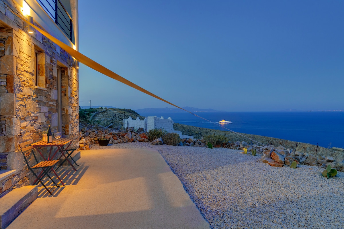 Deli mövqeyində, qiyamət təpəsində 20 m2-lik daş qonaq evi. Ətrafdakı adalara (Tinos, Mykonos, Paros) və Ermoupoli limanına baxışlar. Divanı - çarpayısı var; soyutma üçün tavan ventilyatoru və kondisioneri var. Mətbəxə soyuducu, yemək bişirmək üçün soba və soba, filtr qəhvə maşını, toster və bütün lazımi ləvazimatlar daxildir. Wi-Fi və televizoru var. Günəşin doğuşundan və axşam ayından zövq almaq üçün mükəmməldir.