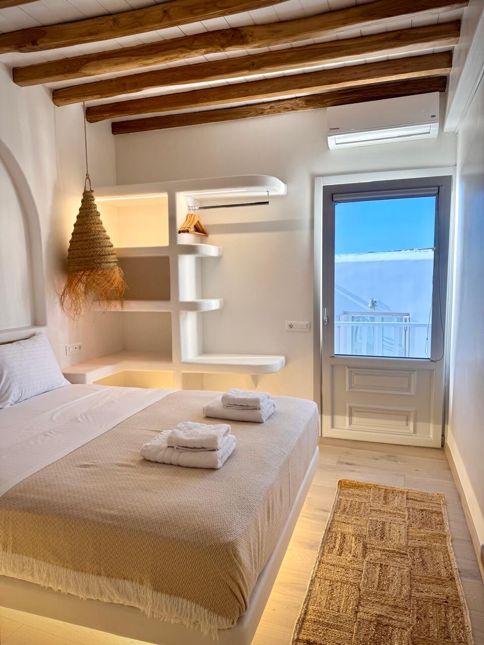 39 m² lüks süita + 45 m² veranda, ayrıca hovuz, 3 nəfərlik açıq havada cakuzi və panoramik dəniz mənzərəsi. Anatomik döşəyi olan çarpayı, qaz tükü divanı (1 nəfərlik), tam təchiz olunmuş mətbəx, pulsuz Netflix ilə 55 düym Smart SAMSUNG TV və Bluetooth Hi-Fi SONY səs sistemi daxildir. Açıq havada yemək yemə imkanı və Kiklad üslublu böyük mebellə təchiz olunmuş terras. Tam məxfilik, 5 ulduzlu rahatlıq və köməkçi dəstəyindən yararlanın. Dəbli, özəl və qeyri-adi unikal Mikonos tətili axtaran cütlüklər və ya kiçik ailələr üçün idealdır.