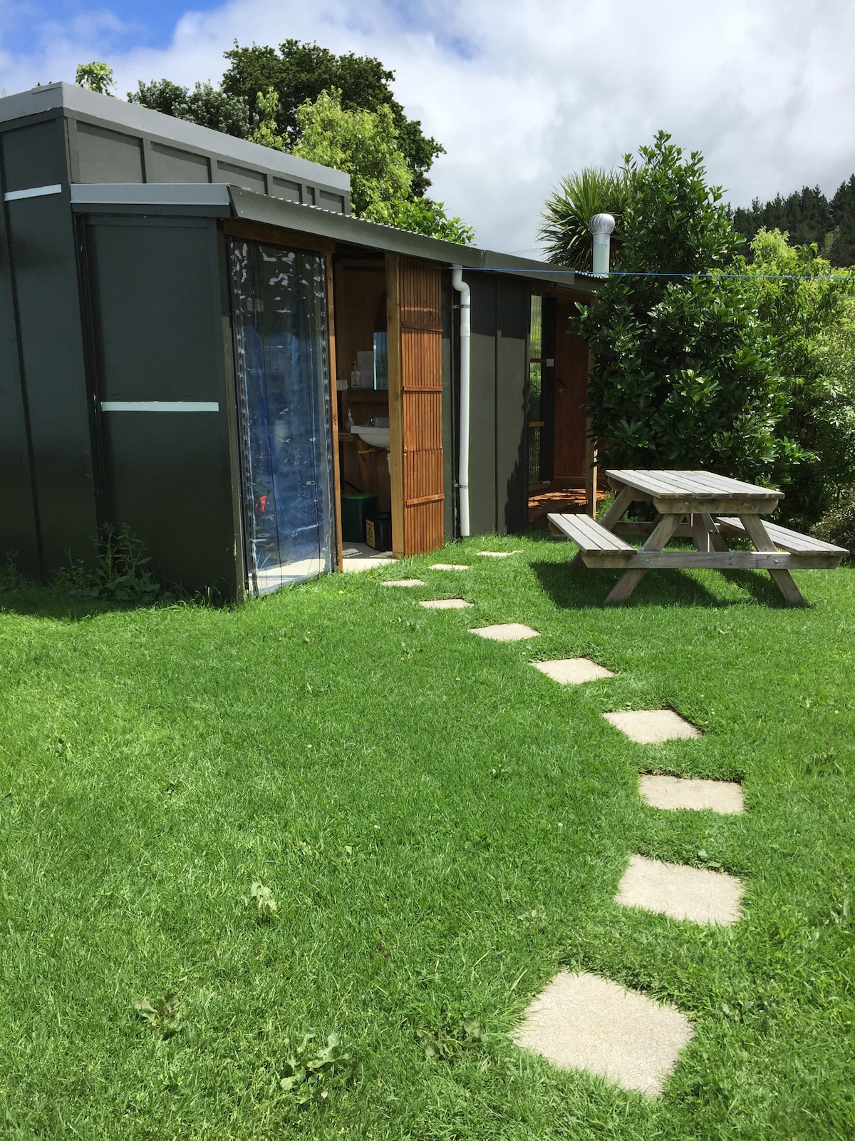 Tökülməyimizin arxasında dayanmaq dəbli qonaqlama vahidimizdir. Bir tərəfdə yetkin yerli kol ilə əhatə olunan Bell quşları və Tui axşam və sübh vaxtı eşitdiyiniz son və ilk şey olacaq. Kraliça çarpayısı, ikinəfərlik və birnəfərlik çarpayıya bükülən divan və digər qatlanan tək qatlama cihazı asanlıqla 6 yatır. Tam təchiz olunmuş balaca mətbəx və yemək sahəsi var. Ayrıca, lakin bitişik hamam otağında çubuq vannası, duş və bir tualet Lazım gələrsə, çadırları yığışdırmaq üçün çoxlu qazon var.