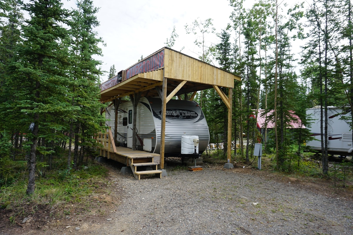 Nightly price is $80 ($10 total for pets) Our family-run campground is located right off the Alaskan Highway (beside 40 Mile Air, mile post 1313) close to the town center, restaurants, a park, native culture, and outdoor adventure. This unit has recently been upgraded with a porch and shade roof nestled in the pines. Visit our community fire ring and socialize with fellow campers. Walking paths in front of the Campground go all around town.