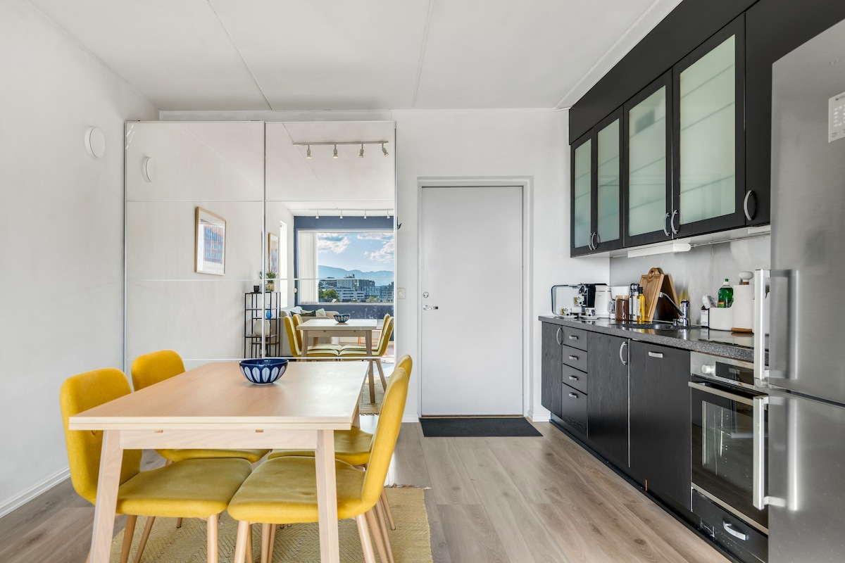 Mənzil genişdir və heyrətamiz mənzərəsi var. Tromsø və onun ətrafına 180 dərəcə mənzərə açılır. Dağları, fyord, Arktika kafedralını, kabel avtomobilini və dağları görə bilərsiniz.. Şimal işıqları bizim üçün rəqs edirsə, eyvanlardan asanlıqla görünə bilər. Mənzil bir çox görməli yerləri, restoranları, qalereyaları, kafeləri, muzeyləri və mağazaları ilə şəhər mərkəzində yerləşir. Hər şeyə qısa bir gəzinti.