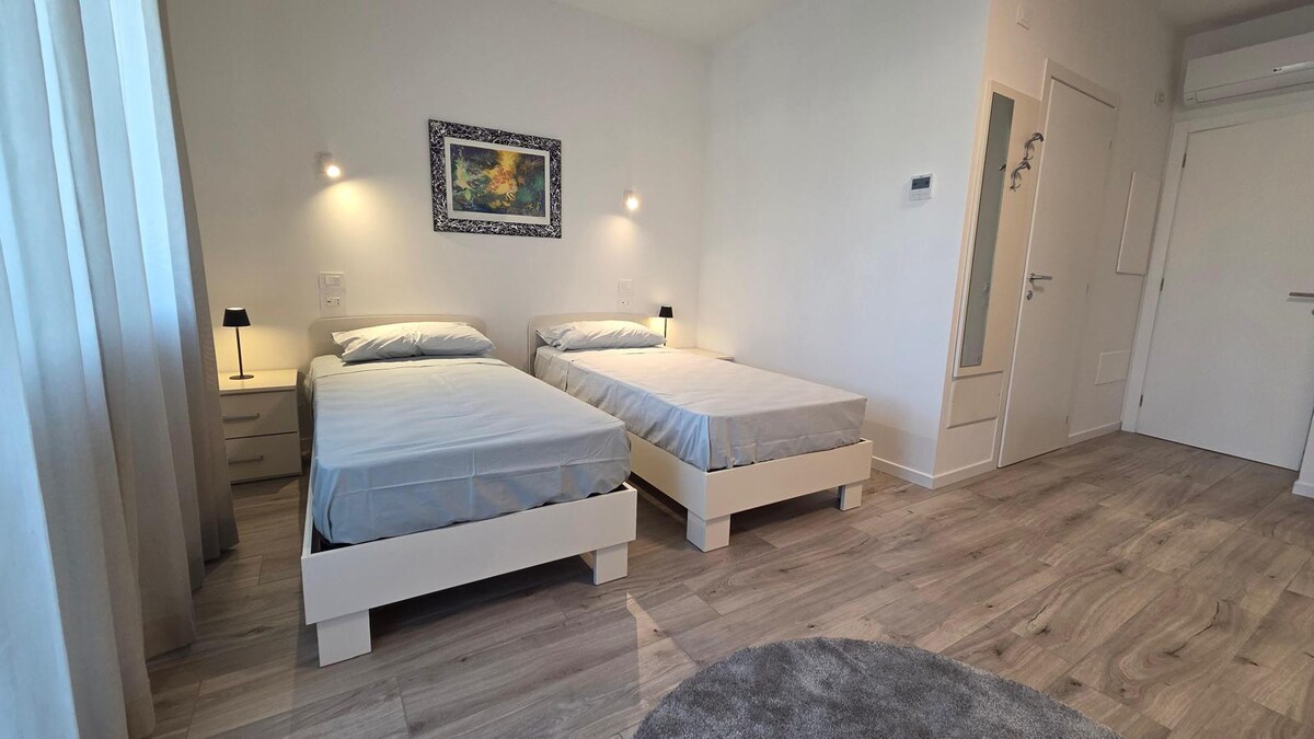 Şəxsi parkinqi olan, təchiz olunmuş mətbəx, yataq dəsti, mətbəx və hamam otağı, Wi-Fi, paltaryuyan maşın, kondisioner, Smart TV, iş stansiyası və verandalı açıq bağça ilə təchiz edilmiş rahat və rahat mənzil. Hər şeyə çox rahat gözəl həll yolu. Avtobus dayanacağına cəmi 5 dəqiqəlik məsafə var. Lobbiyə, KIOENE Arenaya, tarixi mərkəzə, Sərgiyə, Euganeo stadionuna və qatar stansiyasına yaxınıq. Venesiya qatarla cəmi 30 dəqiqə və ya avtomobillə 20 dəqiqədir.