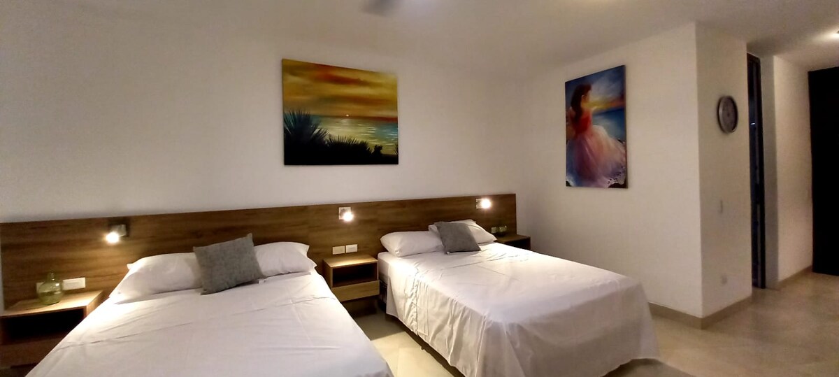 Hermoso departamento 2 dormitorios frente al mar, piso 10, completamente equipado, capacidad para 6 personas, 4 camas, dos baños completos, sala comedor, cocina , agua caliente, espacio para trabajar, cuenta con internet en el departamento, y áreas sociales, parqueadero. 4 ascensores, playa privada, carpas y sillas, canchas deportivas, piscinas adultos y niños, hidromasaje, restaurante, seguridad permanente. El costo del alojamiento incluye los brazaletes de acceso mientras dure su estadía.