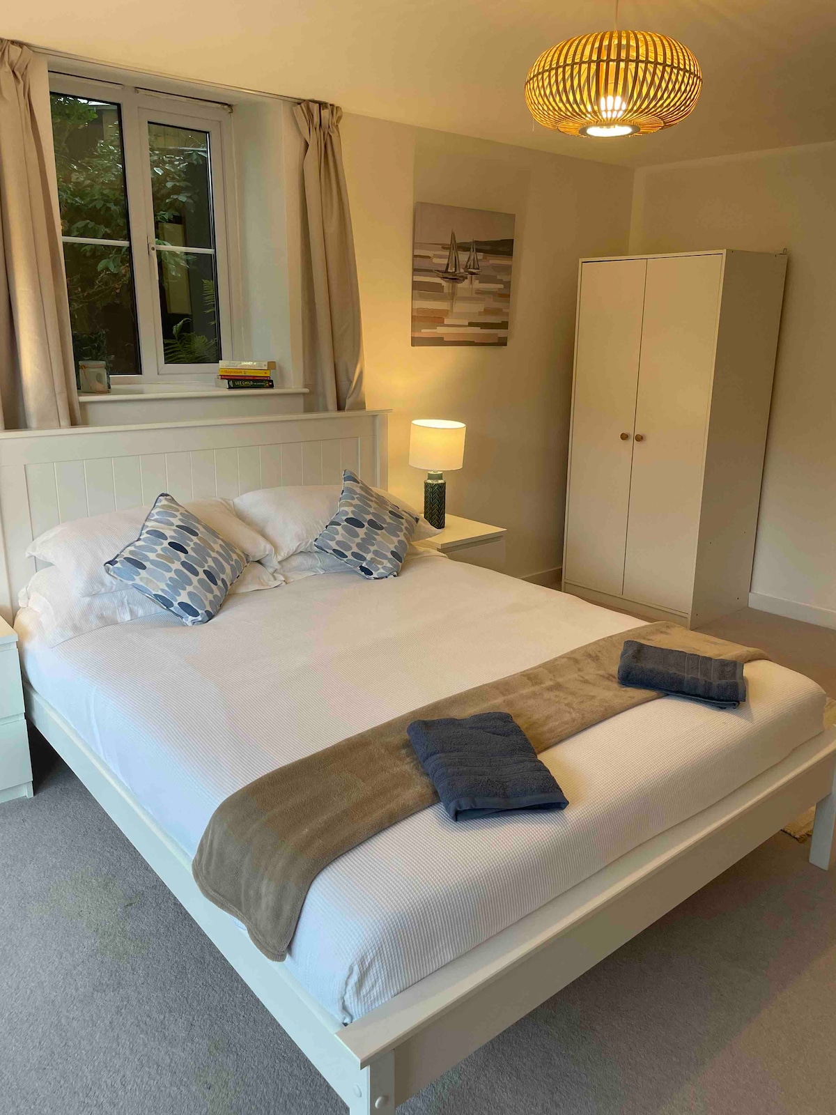 Stunning 1 bedroom apartment just off Torquay seafront, 5 mins walk to the beach & 15 to marina & town centre. Close to the train station & bus stops. Kitchen/Diner/Lounge, It's well equipped & decorated to a very high standard. Private walled outside space, with raised pond & waterfall. Dedicated parking space with EV charger (£0.465/KWH Max charge) . 3 nights min stay 3-5 night min peak season. This is a quiet residential area and thus suitable only for those with a quiet stay in mind