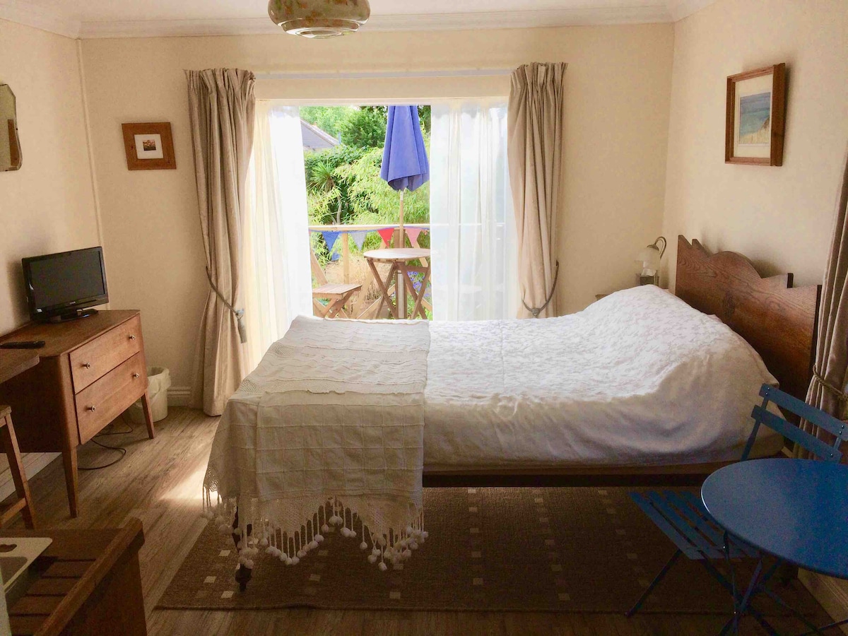 Bu müstəqil, alt studiya Viktoriya evimizin ayrıca bir küncündə yerləşir və cənubda yerləşən bağın üzərində günəşli bir cəhət var. Otaq zövqlə döşənib və burada Art-Deco ikinəfərlik çarpayı, geniş duş, televizor və səhər yeməyi barı var. Səhər yeməyi/qəlyanaltılar hazırlaya bilməyiniz üçün yataq otağında balaca mətbəx ləvazimatları da var. Ayrıca balkona açılan ikiqat qapılar. Tualet otağın çölündə palto, ayaqqabı və çimərlik əşyaları asa biləcəyiniz kirəmitli zalda yerləşir. Sürücü yolu parkinqi mövcuddur.