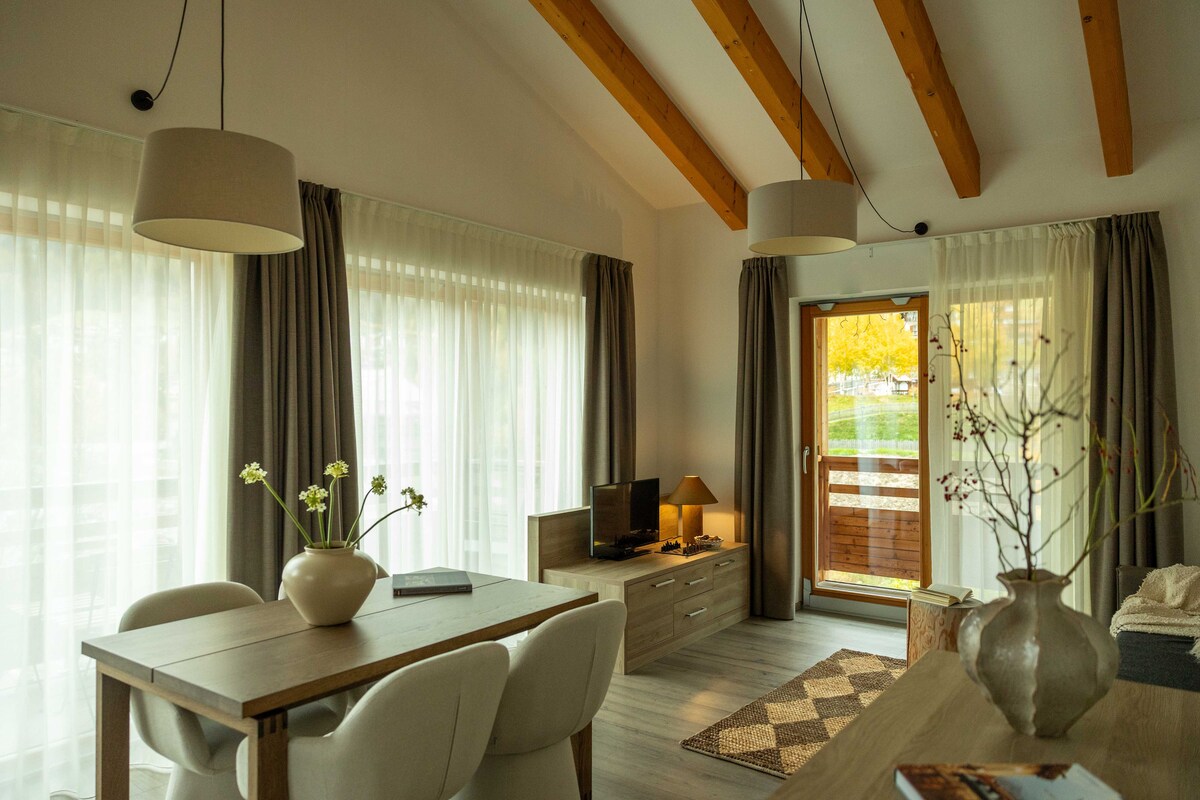 Essence mənzili ikinəfərlik çarpayısı olan açıq məkan, vanna və duşu olan hamam otağı, təchiz olunmuş mətbəx, böyük balkon və evin bağçasına baxan verandadır. Taxta döşəmə və yaşayış sahəsinin mərkəzindəki odun sobası ətraf mühitin hərarətini təmin edir. Rahat və cavanlaşdırıcı qonaqlama üçün rahat və səmimi atmosfer.