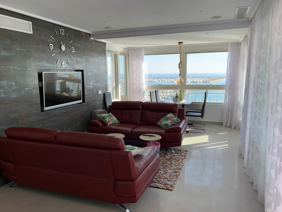 Bu mənzil 8-ci mərtəbədə yerləşir. Bu, Cənub-Şərqdə və Cənub-Qərb mövqeyində balkonların aşağısında yerləşən künc mənzildir. Qonaq otağı bütün sahil xətti boyunca maneəsiz mənzərələrə, Cənub-Şərq və Cənub-Qərbin bütün divarları boyunca pəncərələrə malikdir. Dəniz mənzərəli bütün yataq otaqları. Cənub-şərq və cənub-qərb mövqeyində təxminən 40m2 olan eyvanlar. Gün çıxandan gün batana qədər eyvanlara və qonaq otağına daxil olun.
