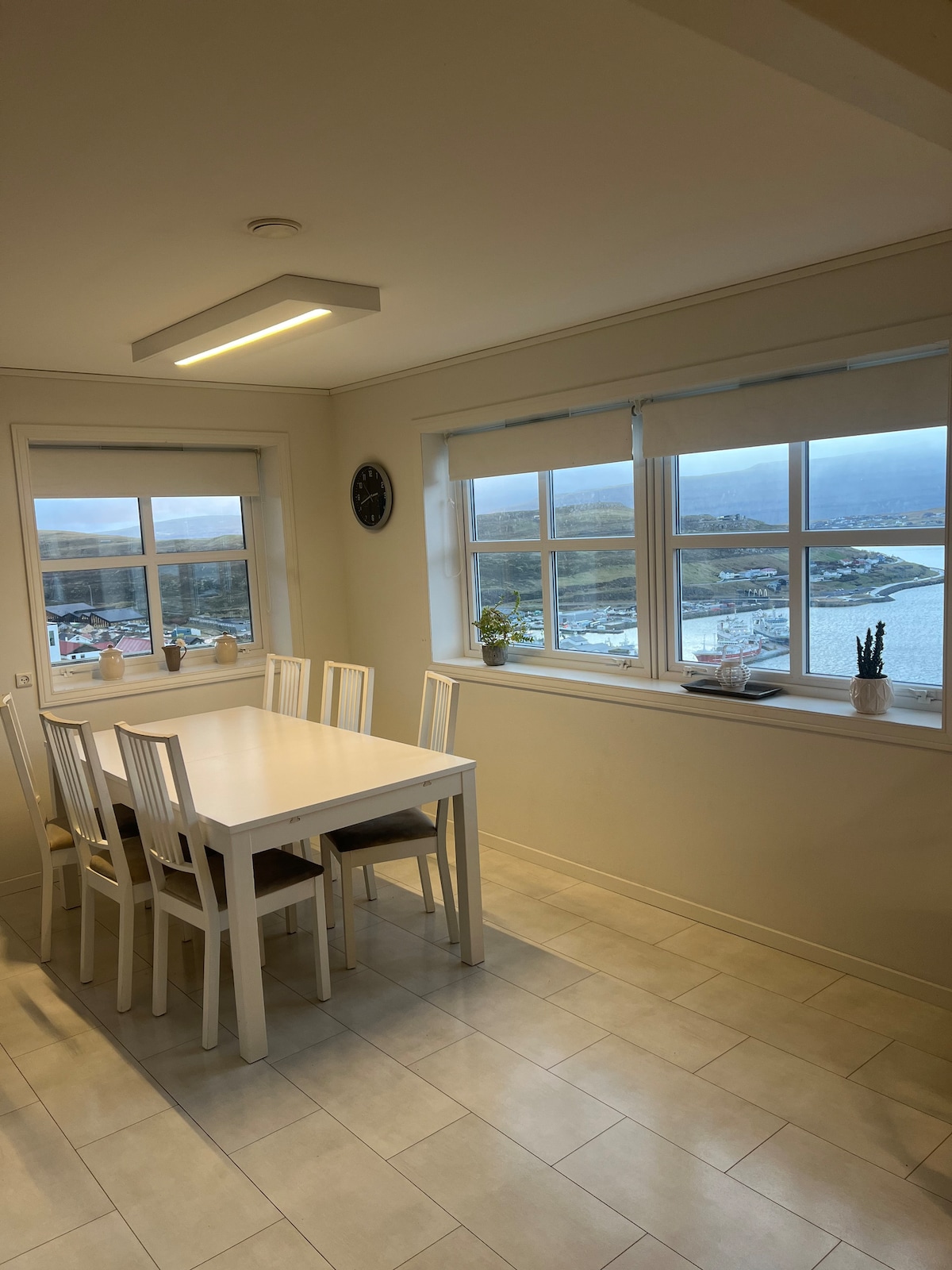 Modern 3-bedroom, 2-bath apartment in Hoyvík with stunning panoramic views over Tórshavn and the ocean. The master bedroom has a double bed and private bathroom. One room has two single beds, and the third has one single bed. Fully equipped kitchen and open living/dining area with ocean views. Located in a quiet, newer neighborhood with grocery store, shopping, restaurants, and a football field all within walking distance.