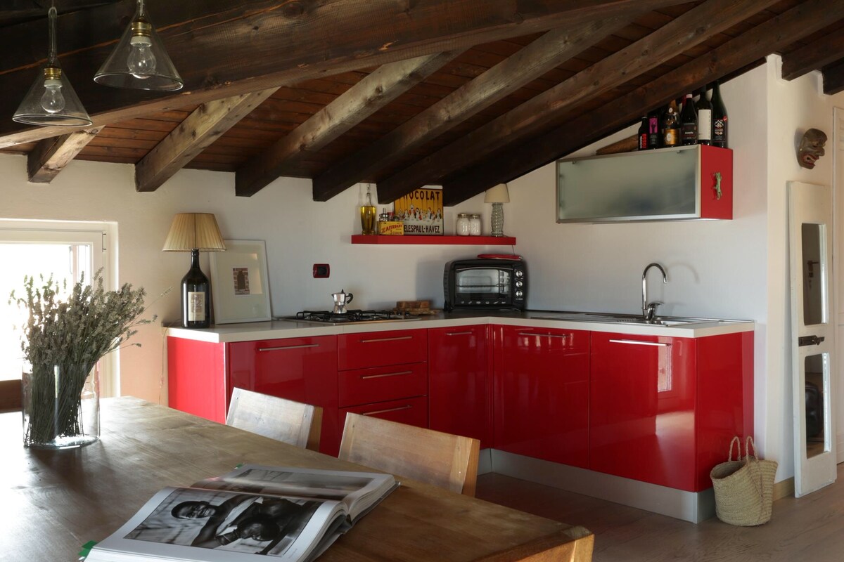 EV taxta darvaza vasitəsilə açıq havada yemək sahəsi və təbii daş divarlarla əhatə olunmuş portikonun olduğu kiçik romantik həyət bağına daxil olursunuz. Buradan yemək masası və odun sobası olan mətbəxə gedən otağa gedirsiniz. Birinci mərtəbədə qonaq otağı, 2-ci mərtəbədə isə iki yataq otağı və hamam otağı var. Əsas yataq otağından göl və Monte Baldo üzərində fantastik mənzərədən zövq ala bilərsiniz. Səhər saatlarında otaq günəş şüası altında qalır.