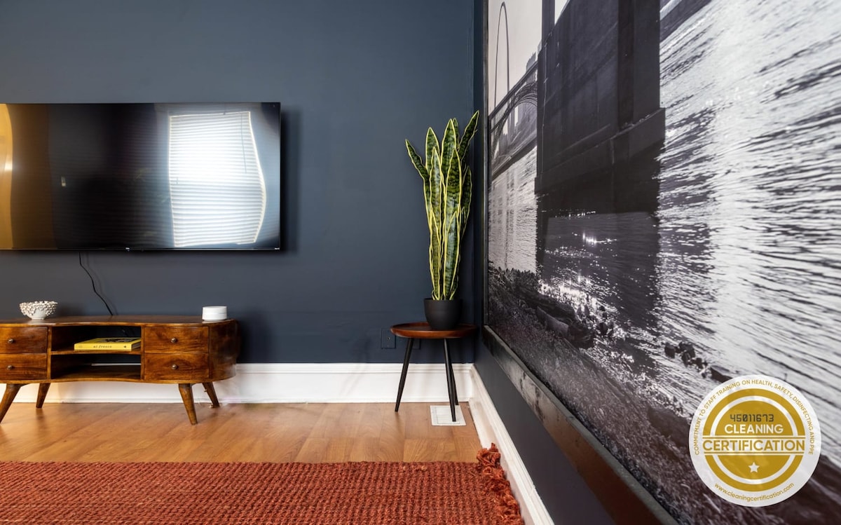 Rustic Retreat in Soulard – Walk to Bars & Farmers Market! Unwind in this cozy 1-bedroom escape in the heart of Soulard, where rustic charm meets modern comfort. Enjoy a plush Queen bed with premium linens, fiber WiFi (500 Mbps), and a fully stocked kitchen with Keurig. The spacious living area is perfect for relaxing, and the in-unit washer/dryer adds convenience. Just steps from Soulard’s vibrant nightlife, top restaurants, and the historic Farmers Market, with a Walk Score of 91. Book today!