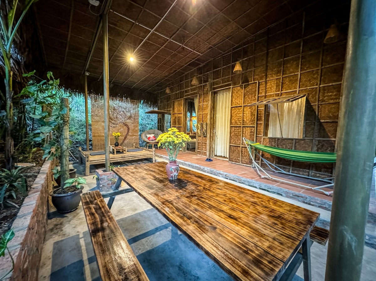 Vyetnamın Şimal dağlıq əyalətlərində etnik qrupların ənənəvi memarlığında tikilmiş unikal bambuk banqaloda qalacaqsınız. Bütün otaqlarımızda vacib təbii dekorasiya var və tam kondisioner (həm soyutma, həm də isitmə üçün), ayrıca hamam otağı, isti su və pulsuz tualet ləvazimatları ilə geniş və rahat dizayn edilib. Banqaloda bir fincan çaydan zövq almaq və ya bütün hava şəraiti ilə oyun oynamaq üçün qamak, yastıqlar və masa olan kiçik terras var