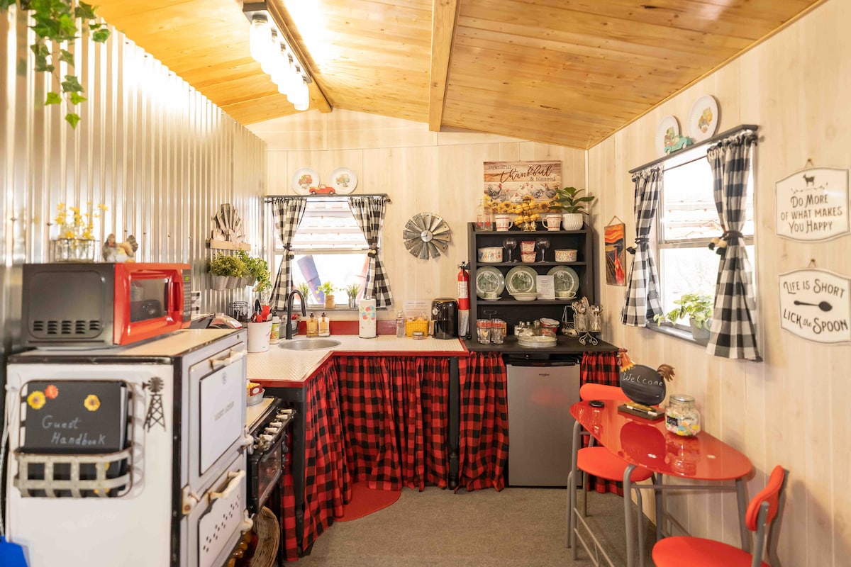 Buffalo Gap-dan cəmi 9 dəq. məsafədə Elm Vadisinə baxan sakit və dinc şərait. Tam təmirli dəmir yolu və kabinə Teylor Dairəsinin ən möhtəşəm mənzərələrindən birinə sahib olan böyük arxa veranda ilə əlaqələndirilib. Dəmir yolu ikisindən böyükdür və böyük ölçülü çarpayı, duş, tam mətbəx və qonaq otağı var. Kabinədə kraliça böyüklüyündə çarpayı, kiçik qonaq otağı, yarım hamam, mini soyuducu və qəhvə barı var. Hər birində ağıllı televizorlar və WI-FI. Bir növ istirahət məkanında dincəlin və dincəlin.