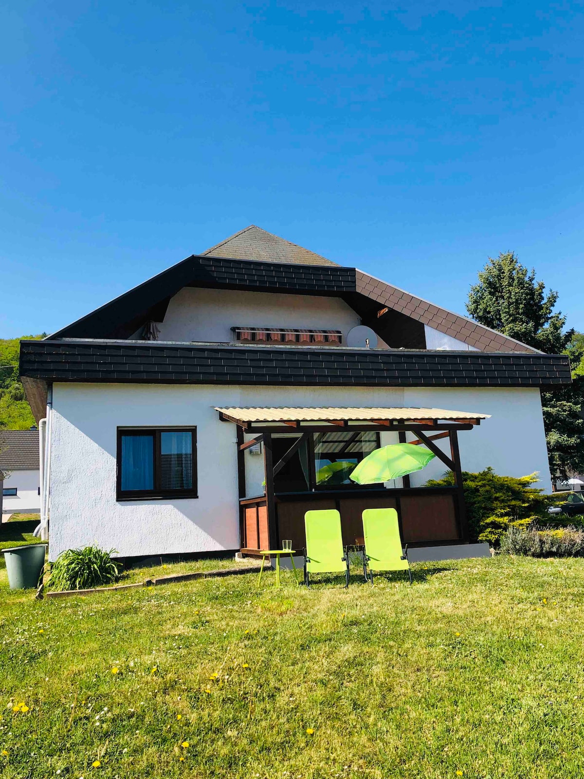 Üzüm bağları, təbiət və amfiteatr arasında xoş gəlmisiniz! Yüksək keyfiyyətli mebellə təchiz edilmiş, təxminən 90 kvadratmetrlik yataq otağı şəhərin köhnə şərab rayonu olan Trier-Oleviqdə yerləşir. 17 kvadrat metrlik cənubi-şərqdə yerləşən terrasdan Eksteryerin mənzərəsi görünür. Ayrılmış bir ailəlik ev pulsuz parkinqi olan sakit ölü küçədə yerləşir. Şəhərə yaxın yerdə və 1200 kvadratmetrlik yataq və ağacların olduğu sahənin ortasında xoruz Hüqo ilə kiçik toyuq sürülərimiz evdədir.