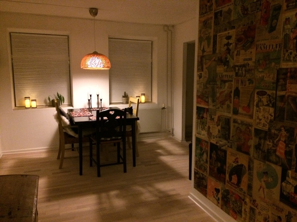 The guest apartment is located in one part of my house, which is located in quiet surroundings close to the city center. There is a separate entrance with a key box and exit to a south-facing terrace. I have chickens in the garden and will supply the apartment's fridge with eggs when there are any eggs. There is free coffee and tea, but you must bring your own milk and breakfast. I also live in the house, which is old and we all have to show consideration for each other of course.
