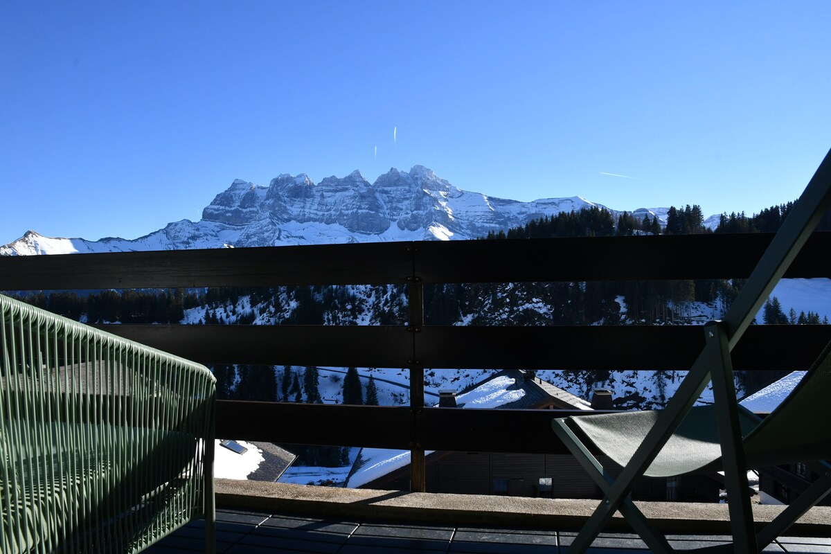 Studio cosy, entièrement rénové et équipé, à louer dans le village de Champoussin, idéal autant pour de petits weekends prolongés en amoureux que pour des vacances à la semaine - une place supplémentaire pour un enfant peut être envisagée grâce à un canapé-lit ou une couchette pour bébé. Exposé plein sud, vous profiterez d’un balcon baigné de soleil (crème solaire vivement conseillée !), aux premières loges pour contempler les magnifiques Dents du Midi.