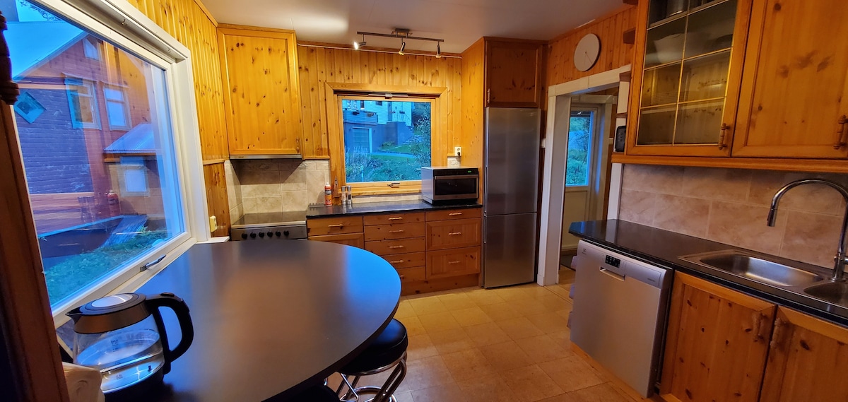 Mənzərədən və balkondan şimal işıqlarından zövq alın və ya spa vannasında dincəlin. Paltaryuyan maşın, quruducu, SPA vannası, dəsmallar, yataq dəsti, yuyucu vasitələr, mətbəx və kabel televiziyası/internetdən pulsuz istifadə Cəmi 4 nəfərlik ikinəfərlik çarpayısı olan 2 yataq otağı. Beşinci qonaq üçün rahat şişirdilə bilən yüksək hava döşəyi (90x200x40sm) yataq otağına və ya qonaq otağına qoyula bilər. Avtomobil üçün pulsuz parkinq. Mənzilə qədər pilləkənləri olan evin arxa tərəfində giriş.