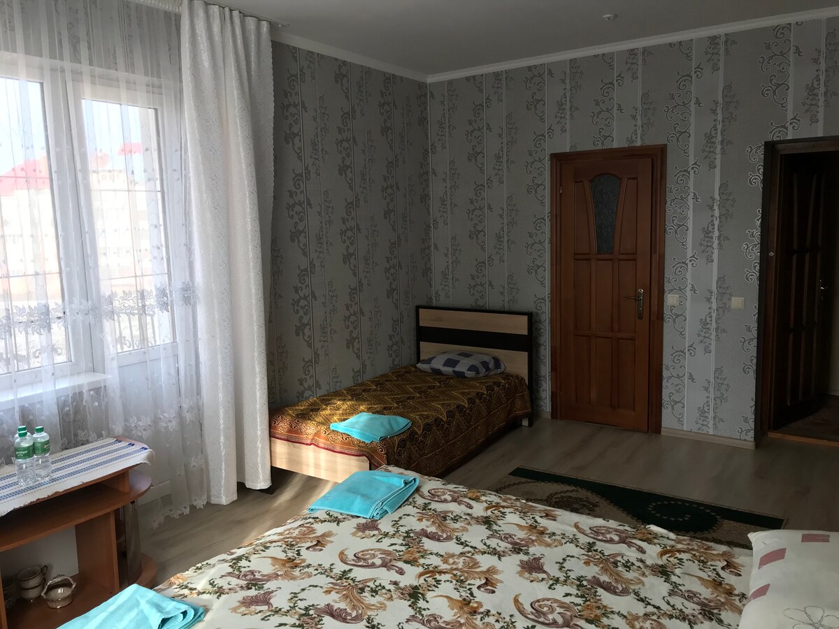 сучасний номер з усім необхідним в новому приватному будинку, який знаходиться у тихому районі міста. Спальня ,ванна кімната, кухня окремо, балкон.Сучасне ліжко з ортопедичним матрасом. У номері цілодобове водопостачання, центральне опалення, швидкісний інтернет, весь посуд, що пригодиться для приготування їжі. Кухонна плита, мікрохвильова піч,електрочайник, холодильник.Душова з сучасною сантехнікою.. Пральна машина,фен, праска, сушка, телевізор та затишна атмосфера . Будинок з відеонаглядом