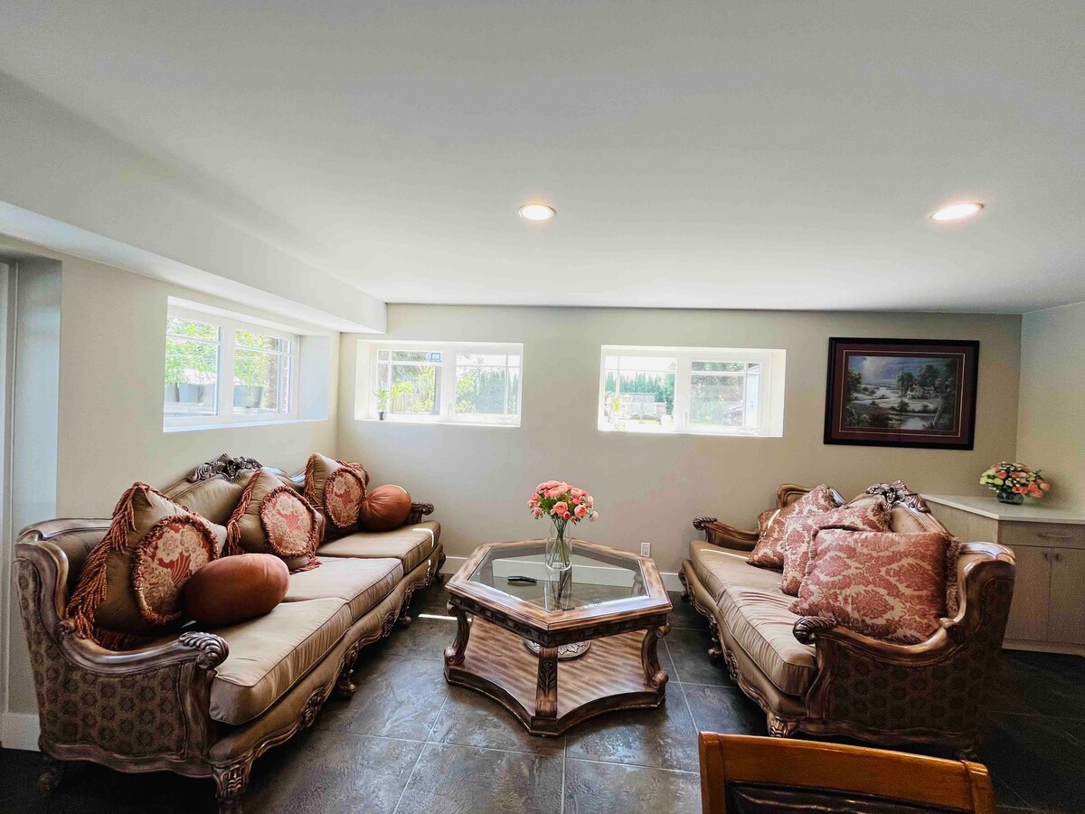 Tsawwassendə yerləşən qısamüddətli qonaqlamalar/Uzunmüddətli Tətillər üçün Lüks Suitaya xoş gəlmisiniz. EV HEYVANLARINA UYĞUN Airbnb-dir. Bərə 5 dəqiqəlik məsafədə, Meqa Mall və Groceries-ə 5 dəqiqəlik məsafədə, Çimərliyə 2 dəqiqəlik məsafədə, Vankuverə 20 dəqiqəlik məsafədə yerləşir. Qonaq Otağı yeni tikilinin zirzəmisində yerləşir. QONAQLARIMIZ ayrıca girişi olan 100% Məxfilik əldə edir (Paylaşılmır) 100% Dincdir. Bdr-də gr8 Günəş işığı var (fotolara baxın) Avtomobil yolunda parkinq Yataq dəstləri,hamam və bədən yüksək keyfiyyətə malikdir. Geniş camaşırxana. QONAQLAMANIZ@yerimiz yaddaqalan olacaq.