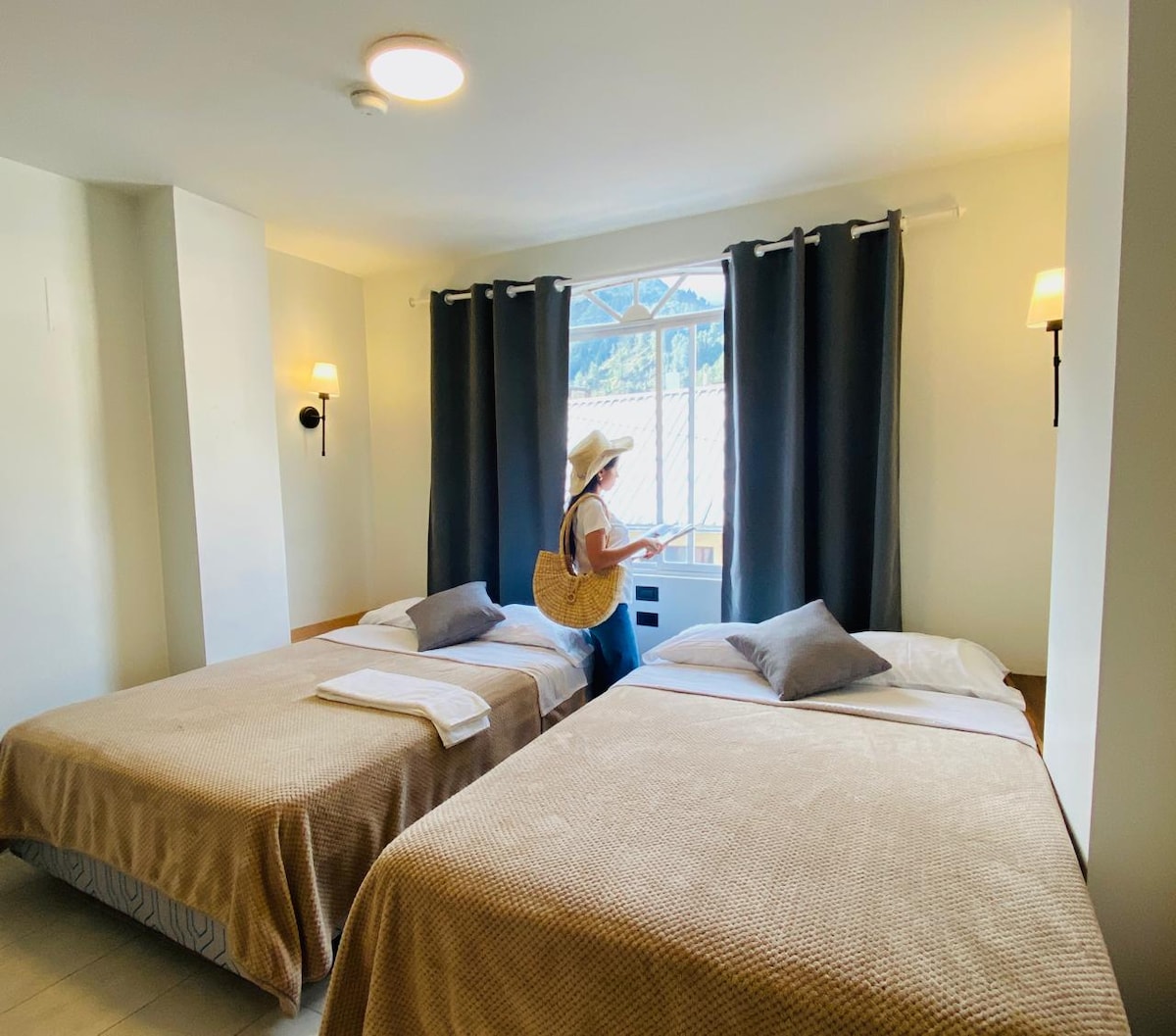 Habitación cuadruple ubicada en el centro de Baños de agua Santa muy cerca a restaurantes, tiendas, operadoras turisticas. La habitación cuenta con una cama doble y 2 camas de sencillas con baño privado.