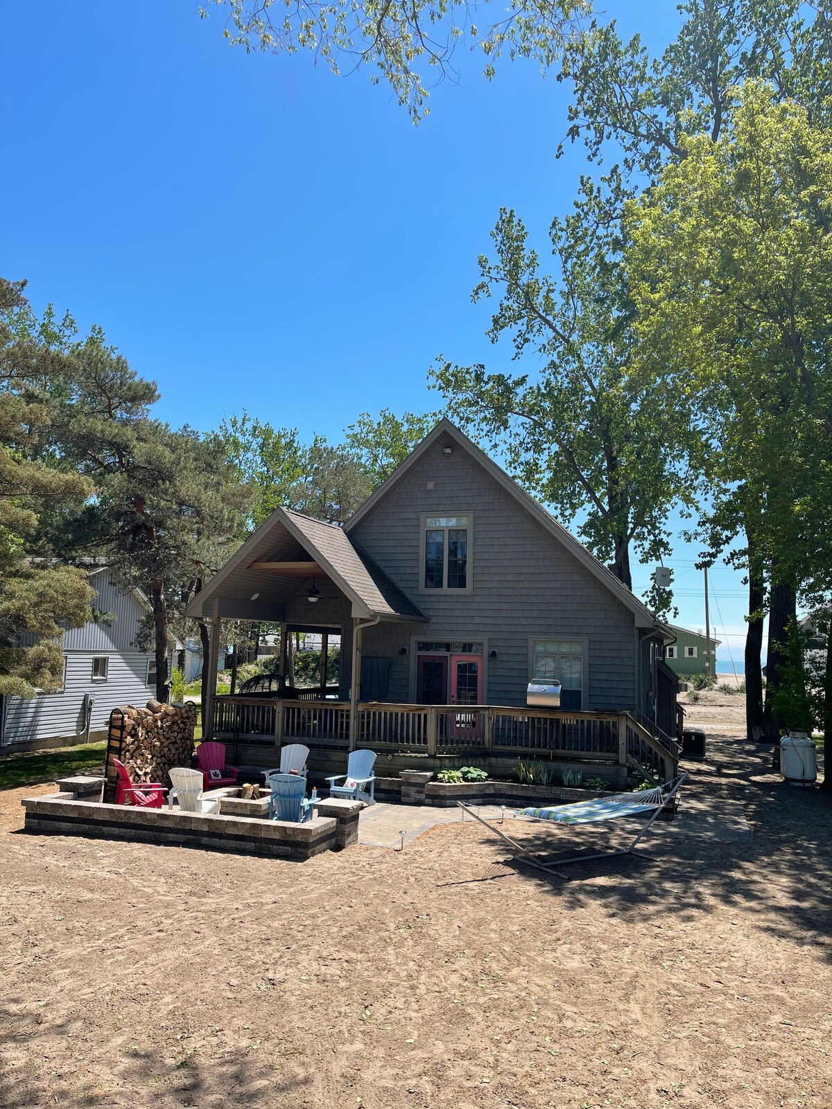 Take it easy at this unique and tranquil 4 season, 2 bedroom, getaway. Close to the great lake and all amenities. Close enough to walk to the beach and easy access to eateries. Just around the corner is a baseball diamond and playground area. Large private treed backyard, room to play, area to hang a hammock, 2 decks, barbecue, and dining area. Roast marshmallows on your own campfire, amongst the park like setting. Quiet, peaceful private outdoor getaway. Ideal for couples and small families.