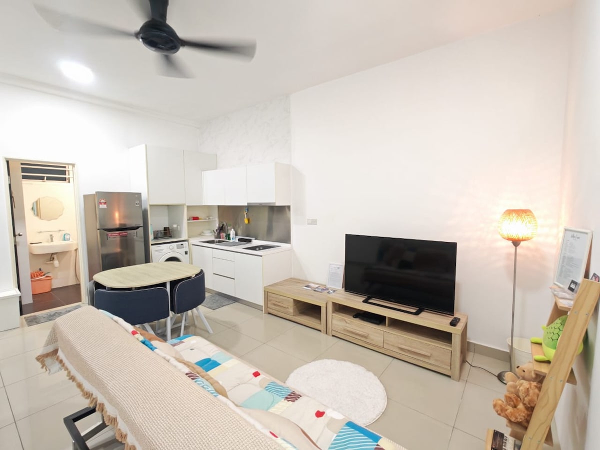 (1+1 BR & 1 bathroom) Contemporary modern and cozy condo in the heart of JB city centre. Suitable for 4pax family, friends and business group. **5mins to CIQ, City Square, KSL, Pelangi, and Larkin **8mins to Mid Valley Southkey, Larkin Sentral and Sentosa **15 mins drive to Paradigm mall, Sutera, Skudai and Mount Austin ✔ 4K SmartTV ✔ High Speed Wi-Fi, working tables with extension plug ✔ Washer ✔ Airconds in every rooms. ✔ Atari console, Mahjong, and Board games. ✔ FREE parking for 1 car