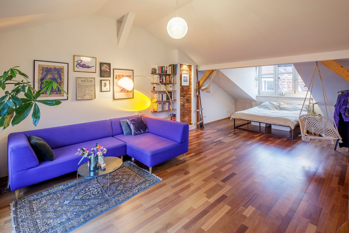 Gözəl mənzilimiz XIX əsrin sonunda tikilmiş gözəl bir evin çardağındadır. Yaradıcılığı olan çox parlaq və müasir bir yerdir. Mənzil yataq otağı, mətbəxi olan qonaq otağı, hamam otağı (vanna və duş ilə) və balkondan ibarətdir. Hər bir otağın hündür tavanları və dam pəncərələri var (Bu pəncərələri və balkon qapısını qaraltmaq mümkün deyil) Mənzil pulsuz parkinq zonasına (800 m) yaxınlıqda yerləşir.