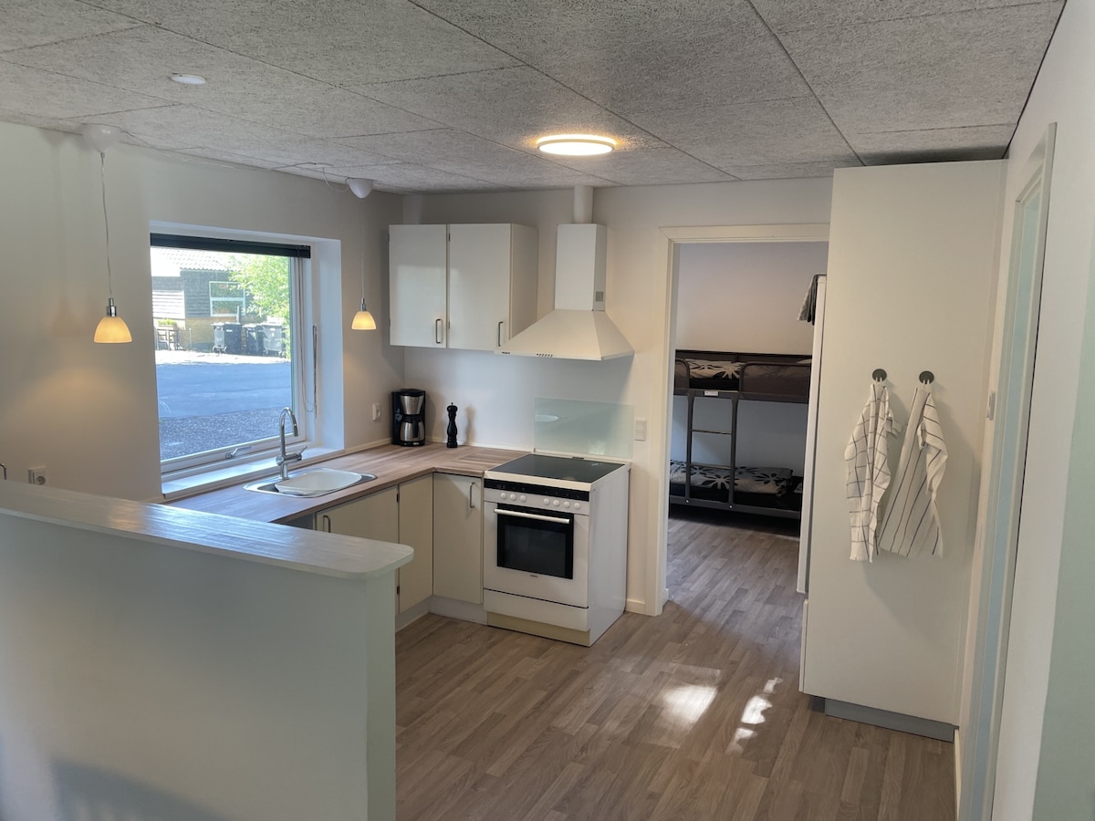 Boligen er nyistandsat i 2019 med gulvvarme, nyt køkken og badeværelse med bruser og væghængt toilet. Soveværelse med dobbeltseng og en opredning i stuen til to personer. Køkkenet har komfur med emhætte, mikroovn , opvasker, kaffemaskine, elkedel og køl og frys. Der er egen udestue med bord og stole. Med egen p-plads. OBS! Ingen rygning indenfor og i udestuen. Alt rygning skal foregå udenfor.