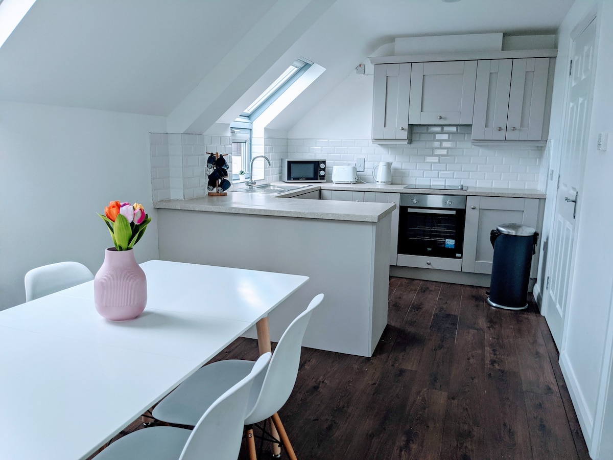 Belfastın mərkəzində gözəl və son dərəcə rahat 2 yataqlı mənzil. Yenilənmiş mənzil turistlər və alıcılar üçün idealdır. NI Turist Şurası sertifikatlaşdırılıb. - Öz-özünə xidmət/çıxış - Yerli tövsiyələr və görməli yerlər haqqında verilən məlumatlar - 2 avtomobil üçün dayanacaq - Yaxınlıqda oyun meydançası - Səyahət kotleti və yemək stulu təmin edilir - Hər yerdə gəzə bilən - Çay və qəhvə təmin edilir - Genişzolaqlı və Netflix daxildir - Mağazalara/restoranlara yaxındır. - Şəhər Bələdiyyəsinə və alış-veriş məkanına piyada 5-10 dəqiqəlik məsafə