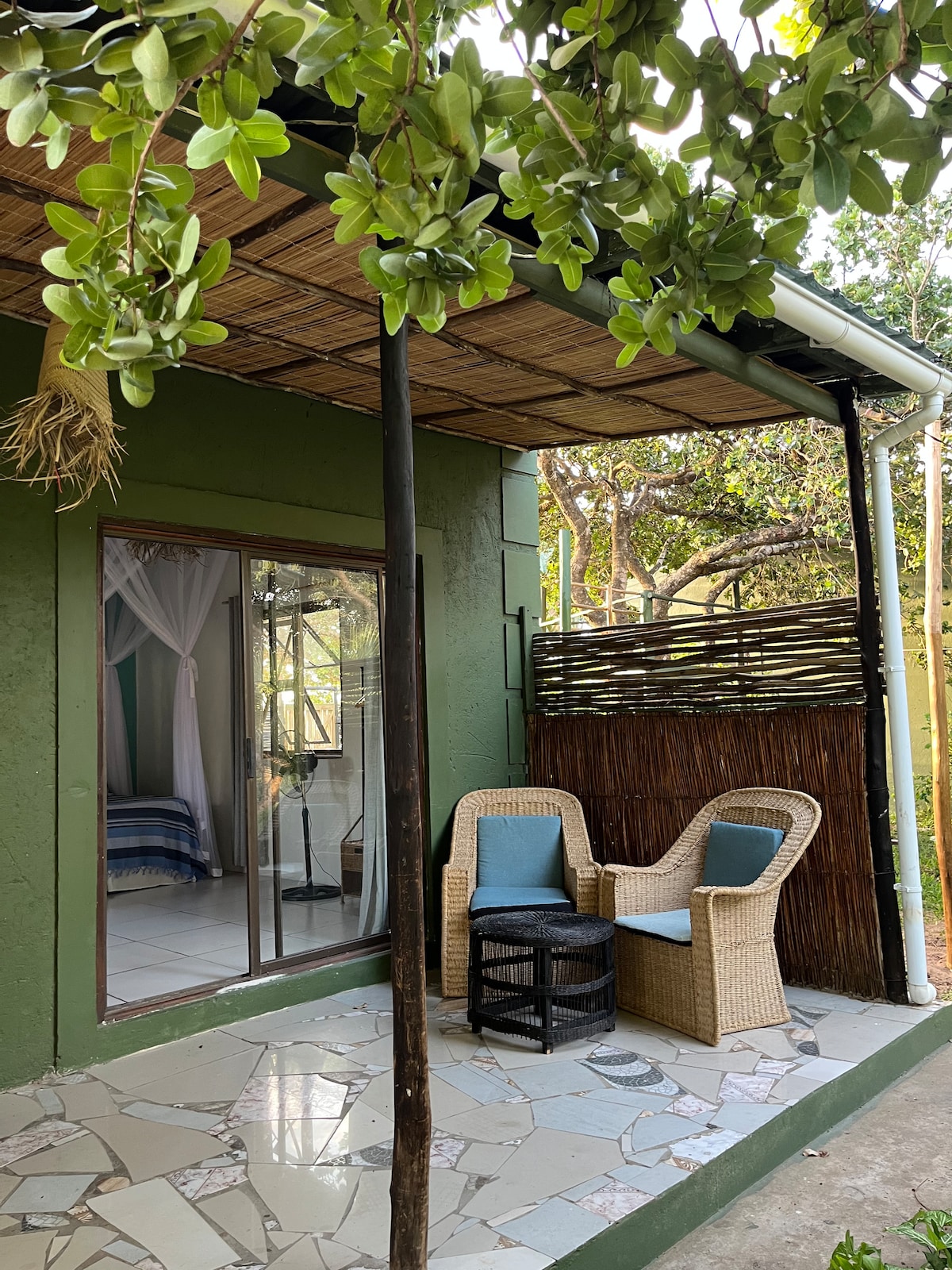 Studio with kitchen, private balcony and view of the trees and jungle. Your home is next to ours, on our land where we grow vegetables, fruit and have free range chickens. Experience the quieter side of Ponta Do Ouro and enjoy the sounds of nature. Beautiful walks in the forest and sunset at the back of the house. There will be a few kids running around but we have created privacy for this studio. The very secluded part of the beach is a 15 min. walk away and the main point 5 mins by car.
