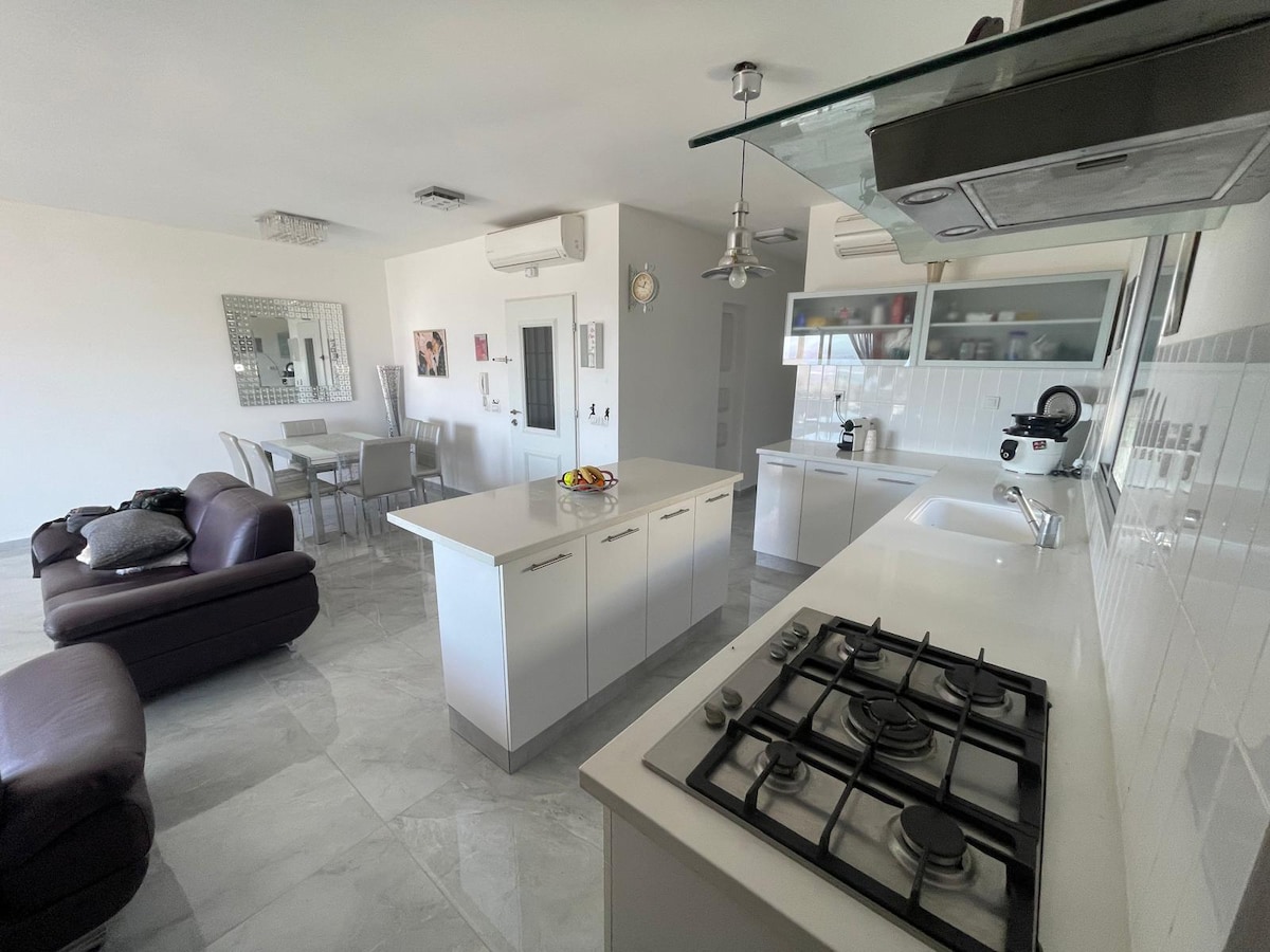 ⚠️Yalnız Ailələrə Ev Sahibliyi ⚠️ Unudulmaz xatirələr üçün mükəmməl bir sığınacaq olan Eylatdakı möhtəşəm penthausumuza qaçın! Qırmızı dənizdəki gün batımlarını seyr etmək üçün ideal yer olan böyük balkonumuzdan körfəzin möhtəşəm mənzərələrindən zövq alın. 3 böyük yataq otağı və 3 vanna otağı sayəsində hər kəsin öz məxfilik məkanı var. Tam təchiz olunmuş mətbəximizdə möhtəşəm yeməklər bişirin və zərif zalımızda zövqlə nahar edin. Pulsuz parkinq, lift və bir neçə addımlıq məsafədə əsas imkanlar təklif edən penthausumuz unudulmaz tətil üçün mükəmməl yerdir!