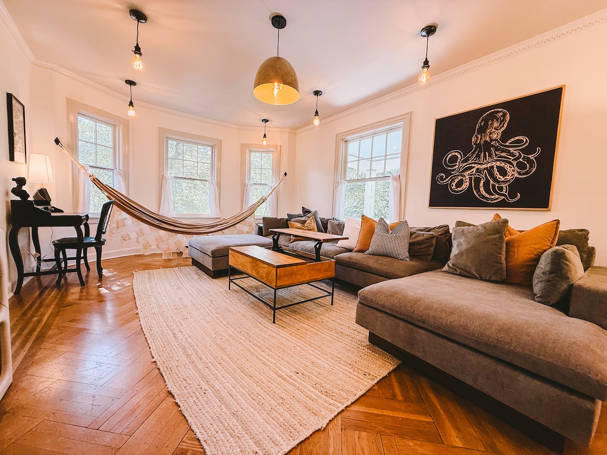 Come experience our recently renovated home, with brand new installed air conditioning, steps from our charmy downtown and direct train to NYC. Intentional Maximalist decor with tons of arts around the house. Blackout curtains in every room and TempurPedic memory foam mattress. 🌿The greenery here on every corner feels like a breath of fresh air. Thoughtfully styled, the home blends vintage charm with modern design touches, creating the ideal space for both relaxation and inspiration.