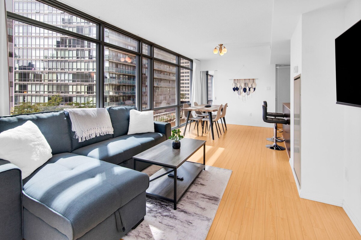 Gaze at a seemingly unending city view through the floor to ceiling windows of this condo that sits high above the downtown hustle. The 46" HDTV has cable and full streaming, the kitchen is fully equipped with a Nespresso and full sized stove, oven and fridge. Easily work from home at the height adjustable standup desk with 19" external monitor, wireless keyboard and mouse. Perfect for a couple on a weekend getaway or an extended stay of up to 3 months.