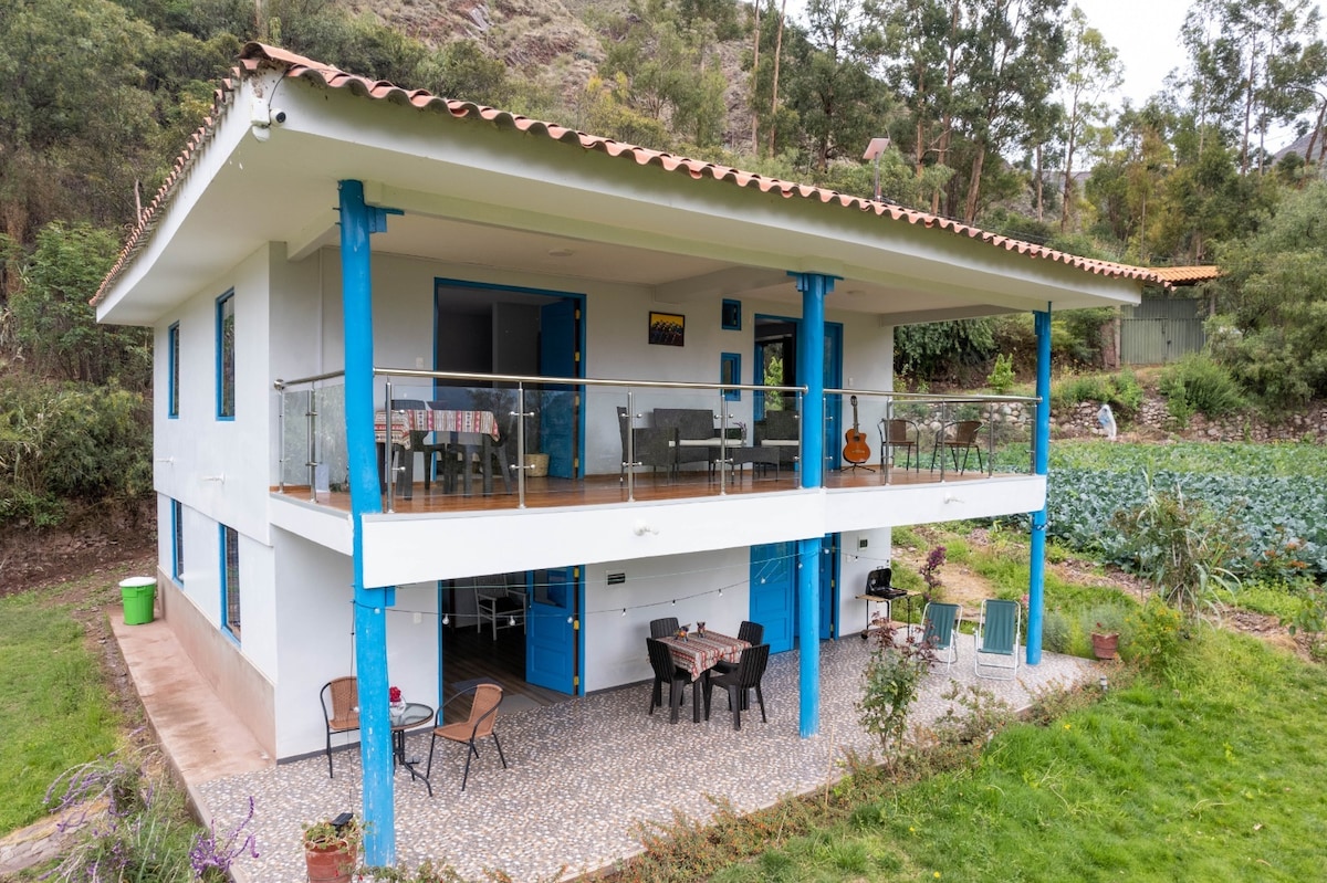 Casa de campo con hermosa vista a las montañas del Valle Sagrado y el campo agrícola lleno de maíz, flores y frutales que caracteriza esta zona, lo que necesitas para una estadía muy tranquila, confortable, relajada con jacuzzi. Despertar con el sonido de pájaros y estar unido con la naturaleza alrededor de la casa. El espacio verde tiene jardín, huerta y parrilla. Wifi muy rápido. Estacionamiento vehicular gratuito en terreno, transporte publico 5 min de la casa, 10 min con carro a Urubamba.