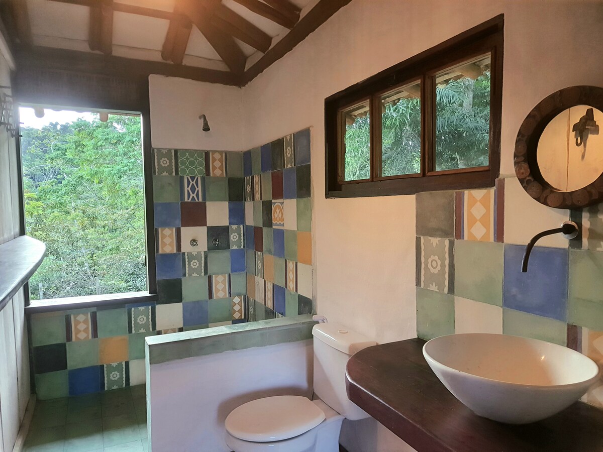 PERFEITO PARA CASAIS: Refúgio sustentável em CHALÉ de bioconstrução (taipa, adobe, garrafas coloridas e cordwood) Cozinha completa integrada à varanda, acolhedor e funcional. Chuveiro quente para relaxar após os passeios. Situado no Sítio Vila Dendê, com mais duas casas e vistas para áreas de preservação permanente (APPs) nos dois lados. 1,9 km da Vila de Serra Grande 2,5 km da Praça 3,9 km da Praia do Pé de Serra 20 km de Itacaré 39 km de Ilhéus Estacionamento gratuito 35 m² de puro charme
