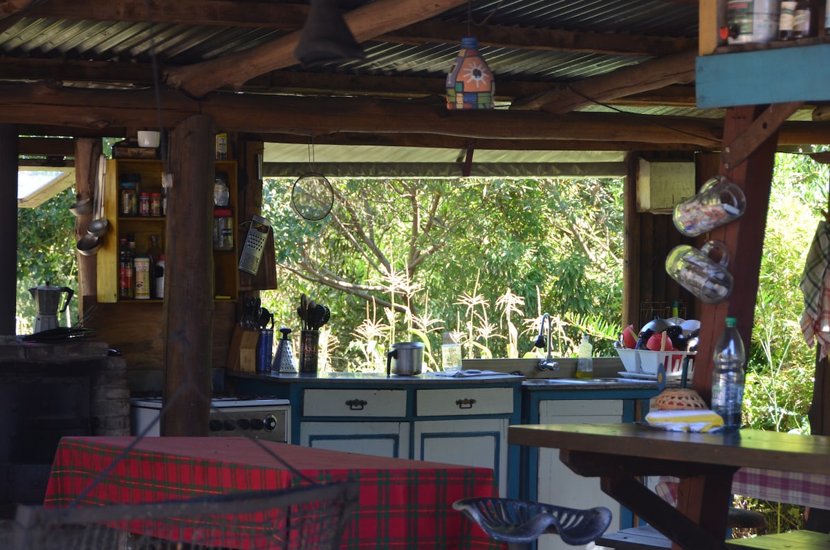 Domo en barrio el bosque, muy cerca de Playa Grande, rodeado de vegetación. Cuenta con baño con ducha y agua caliente y habitación en la cúpula del domo con cama doble y aire acondicionado. Además tiene una pequeña área de cocina con jarra eléctrica, frigobar y utensilios básicos. Es un espacio pequeño, cómo para pasar 2 noches o 3. La habitación es calurosa durante el día, el espacio para estar es un pequeño jardín, con hamacas paraguayas. Predio compartido con mi casa.
