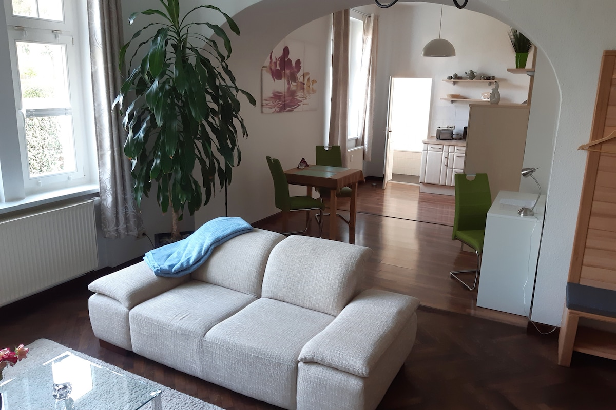 Close to city centre, 10 min by walk, bus- and tram-stop 5 min. 2 rooms incl. kitchenette + bathroom are available, approx. 65m². In bedroom a high quality doublebed in addition a sofa in living room convenient usable for 2 persons (1,60m). Kitchen equipment completely, bathroom with bath + washmachine. In livingroom you find SAT-TV (Astra). Towels, bedlinen, iron, toiletries for free use. On demand I try to assist to find good leasure, culture events etc