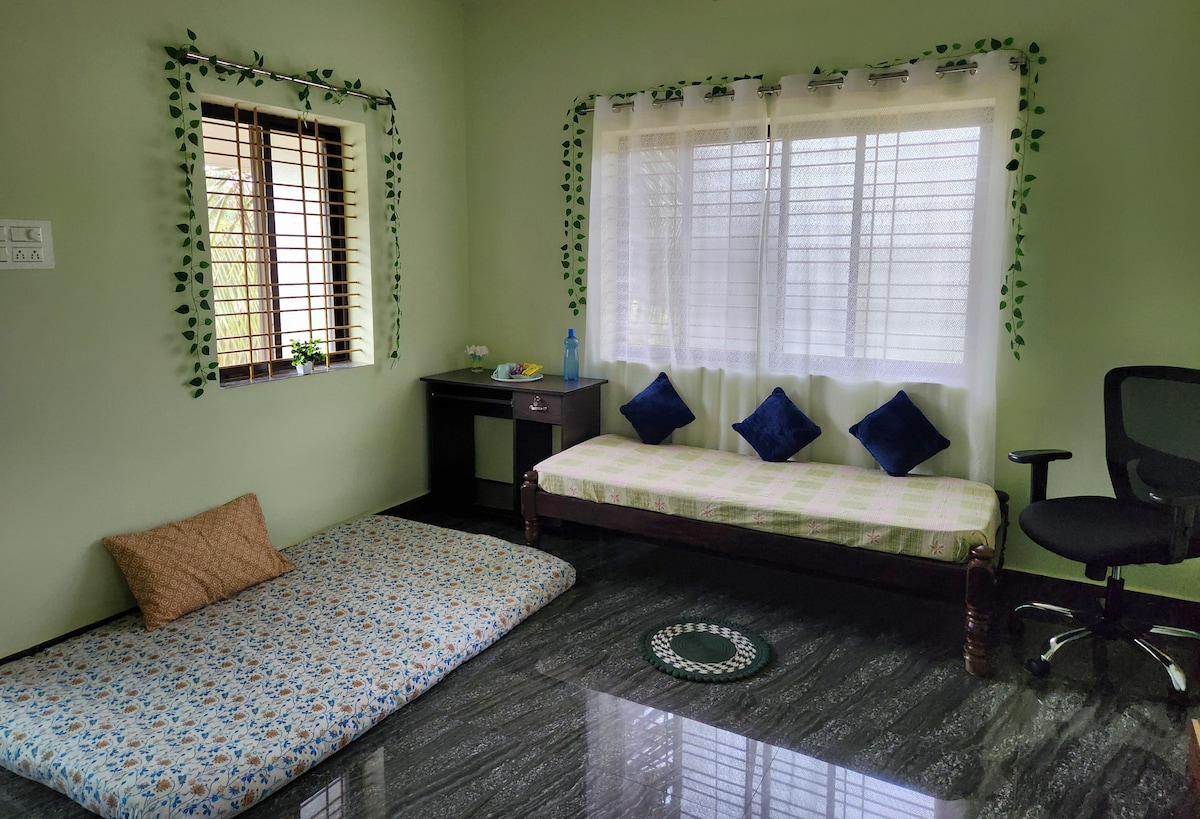 Naikin ailəsinin ev sahibliyi etdiyi rahat mebelli 1bhk evimizə ◆ xoş gəlmisiniz. ◆ Bohemiya interyerinə ilham verdi, iş masası və qarderobu olan yataq otağı. Sabit internet və enerji ilə ◆ ideal uzaqdan iş quraşdırma. ◆ Yaxşı təchiz olunmuş mətbəx: qaz sobası, soyuducu, paltaryuyan maşın. Arxa həyətdə dağların ətəklərində gölməçəyə baxan flora və faunanı ◆ araşdırın. Evdə hazırlanan konkan mətbəxlərimizi ◆ sınayın. ◆ Karvar turizmdən uzaq, dağlar, çay və dənizlə əhatə olunmamış bir gözəllikdir.