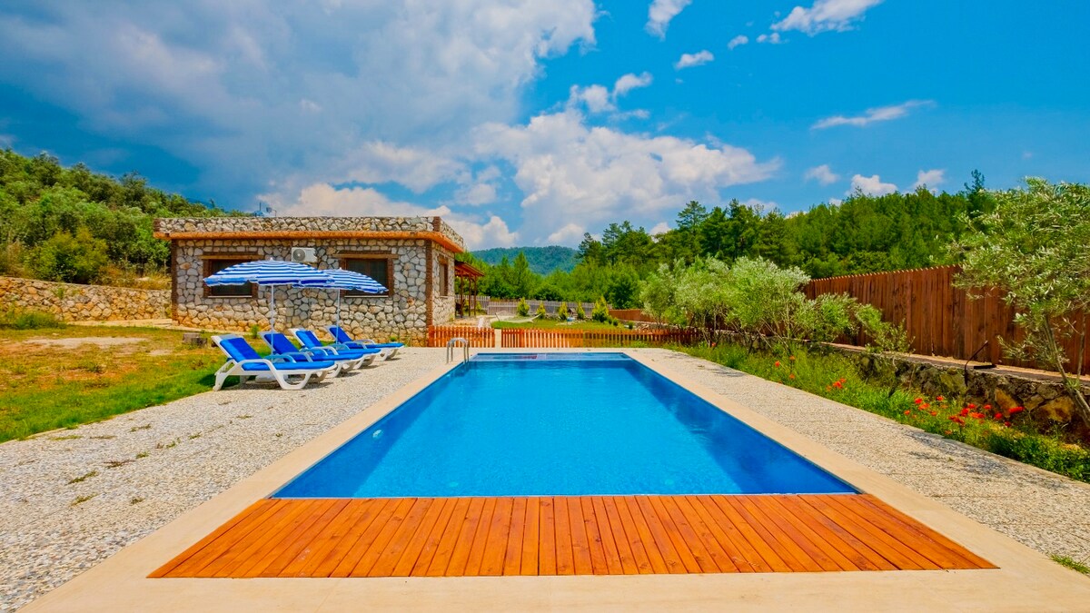 Fethiyenin Yeşilüzlü kəndində yerləşən 2 yataq otağı 2 hamam otağı olan ayrıca hovuzlu villamız təbiətlə əhatə olunub. Yaşıllıq meşənin meşə kənarında yerləşdiyinə görə hava Fethiye mərkəzinə görə olduqca sərin qalır. Bu, yayda sərinləmək istəyən qonaqlarımıza mütləq tövsiyə edəcəyimiz bir seçimdir. Villanın ayrıca barbekü sahəsi mövcuddur. Hovuzun yanında günəş çarpayıları və çətirlər var. Hovuzumuzda cakuzi var.