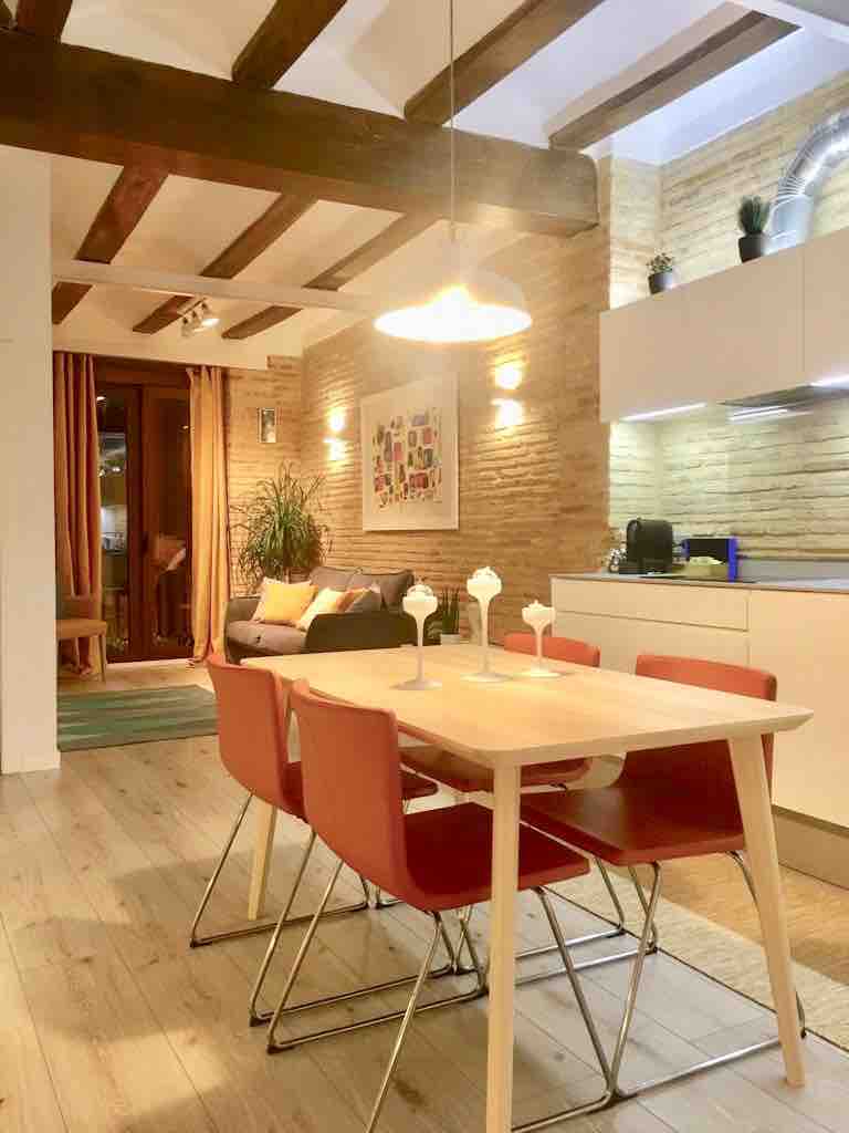 Loft located in the heart of the maritime district of Valencia, El Cabanyal, 5 min. from the Malvarosa beach. House built in 1900 and completely renovated without losing its essence. This stunning apartment fuses traditional architecture with chic boho design in a natural textured setting. Gaze at the high vaulted wood-beam ceilings and exposed brick walls as you dine in the marble kitchen area and cool off in the spacious rain shower.