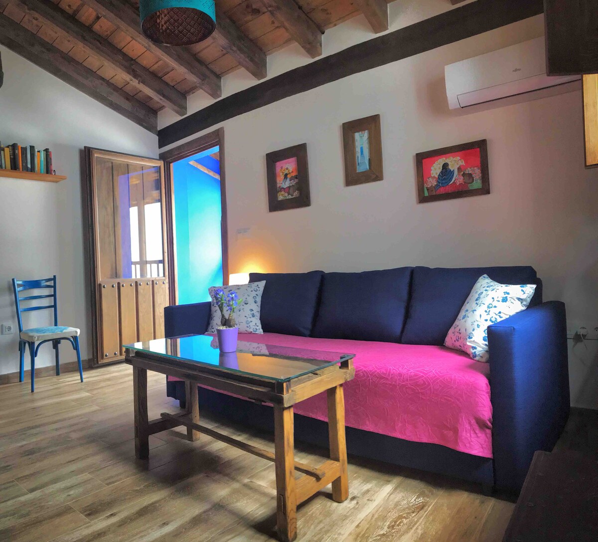 Precioso apartamento, espacioso, con grandes ventanales e increíbles vistas al valle del Tietar y al pueblo. Estás a escasos 3 minutos del centro de Villanueva De la Vera pero apartado del bullicio del centro. Todo está pensado aquí para que puedas “Atalantar”, que es la palabra partocha que utilizamos para expresar que estamos “en nuestro centro”. Un relajante baño con aceite esencial de lavanda en su bañera doble de hidromasaje puede ser un buen comienzo para empezar a Atalantar