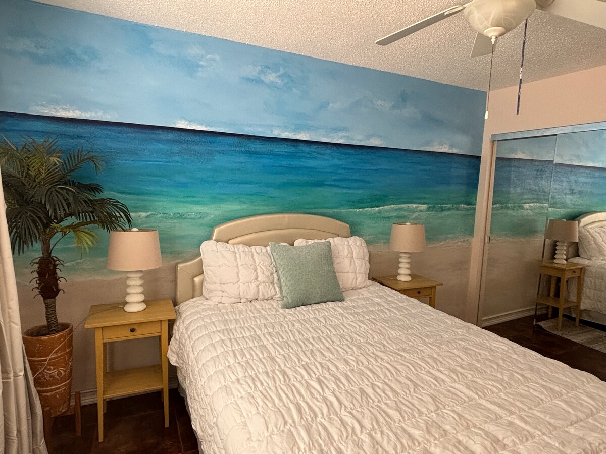 ***Beach service at our private beach for 2 included**** A beautifully decorated studio condo that sleeps 4 comfortably. It includes a queen size bed and queen size sleeper sofa with a memory foam mattress. Not to mention a breakfast bar and 55” TV with surround sound. You can stand on the back deck and see views of the sugary white sand beaches that are right across the street from our place. Beach service at our private beach for 2 included from March-October.