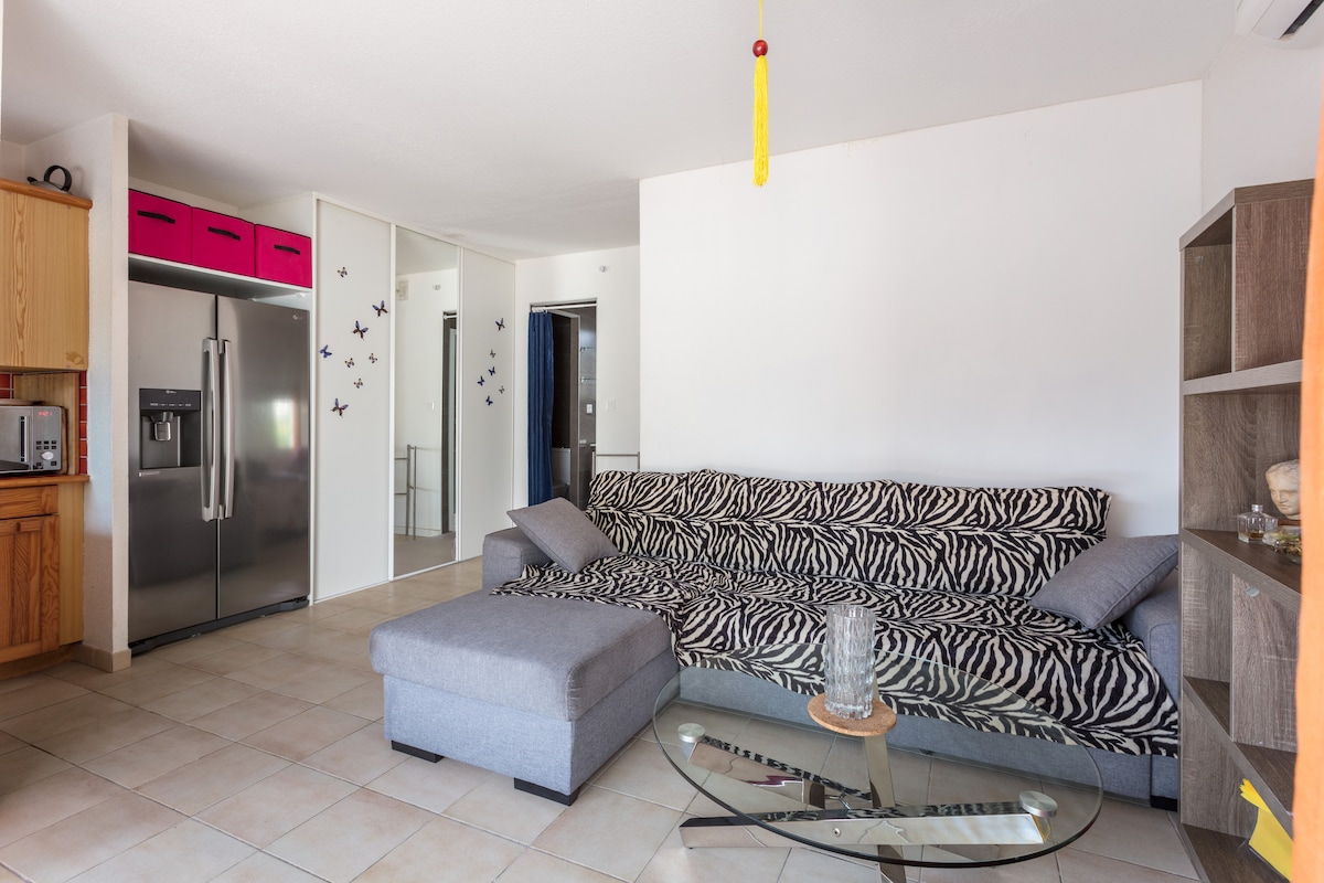 Kiçik mənzil, şəxsi giriş, 17 m2, avadanlıqla təchiz olunmuş mətbəx küncü olan studiya stili, kiçik cihazlar, yemək bişirmək üçün hər şey, paltaryuyan maşın, tualetli duş otağı, kiçik şəxsi terras, yataq üzlüyü və dəsmallar, televizor, WiFi, tərs çevrilə bilən kondisioner. Çantalarınızı yerə qoymağınız kifayətdir... Kəndin mərkəzində yerləşir, yaxınlıqdakı bütün mağazalar və səhiyyə mütəxəssisləri. Balaruc les Bainsdə tətil, spa və ya cütlük üçün idealdır...