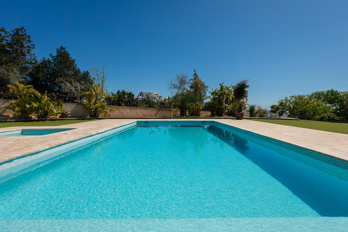 Charming, boutique-style villa nestled in a romantic green garden with old trees & flowers. With its terraces, chillout areas & a lovely little private pool the property offers great space & privacy for 8 to 9 guests. All 4 bedrooms with AC. Internet: high-speed fiber-optic! Within a 6min walk you reach the beautiful sandy beach of Cala Llonga. Restaurants, supermarkets, shops & taxi stand are only a 4min walk away. To Ibiza golf or Santa Eularia it's a 5min drive; to Ibiza Town it takes 12min.