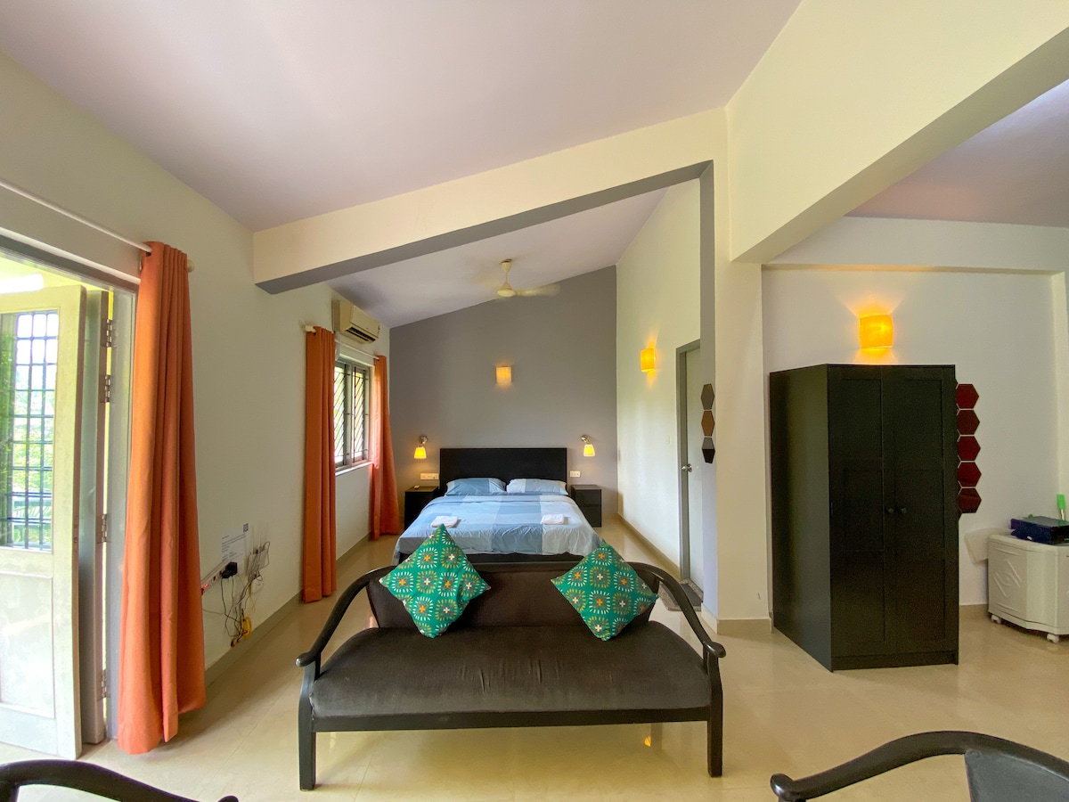 The Verandah is a calm, heritage-inspired stay on Colva Beach Road, offering comfort with prime convenience. Styled with Indo-colonial charm, the home features wooden furniture, earthy tones, cane lighting, and soft olive accents for a relaxed, boutique feel. The spacious bedroom is thoughtfully designed for unwinding. Just 5 minutes’ drive to Colva Beach and 200 metres from the main Colva market, cafés, and shops which perfect for a peaceful yet well-connected South Goa stay.