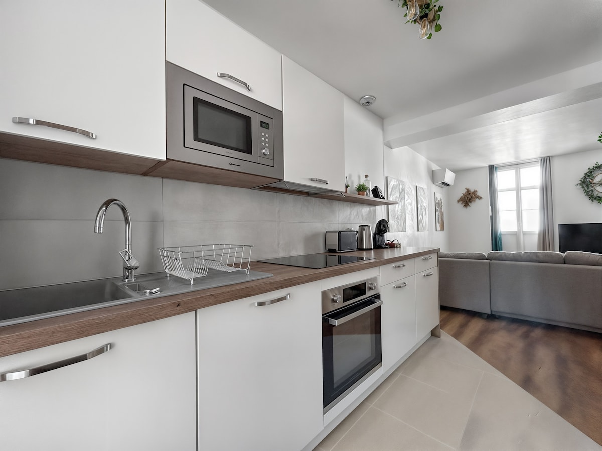 Bel appartement de 70 m², refait à neuf avec goût, caractère et charme, situé au 2ème étage , poutres apparentes. Deux chambres dont une de 18m² avec lit king size 180*200, la seconde est fermée par un rideau ,1 lit de 90 et 1 de 140 pouvant recevoir jusqu' à 5 personnes . La cuisine a été encastrée entre les poutres lui donnant une personnalité hors du commun, tous les équipements sont à votre disposition Vous pourrez vous sentir chez vous , linge, produits de toilette et cheveux fournis.