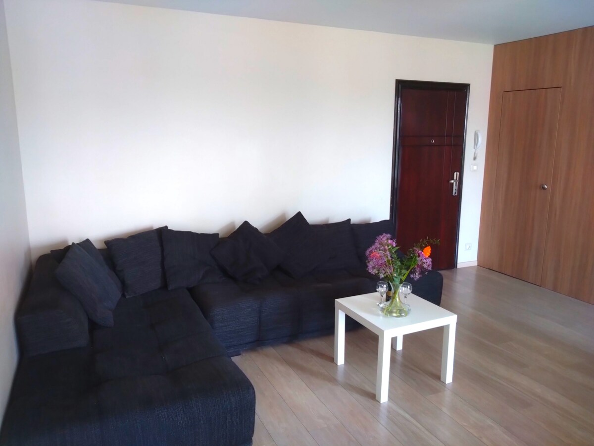 Our spacious one-bedroom apartment has an amazing view that we want to share with you and lots of sunlight. We are situated at the beginning of the central pedestrian zone where you can find a large variety of restaurants and bars as well as places that celebrate the cultural arts. The Sea Garden, the beach and the marina are 10-15min by walking. There is direct access to public transport in front of the building that will lead you to the Mall, Airport and Golden Sands.