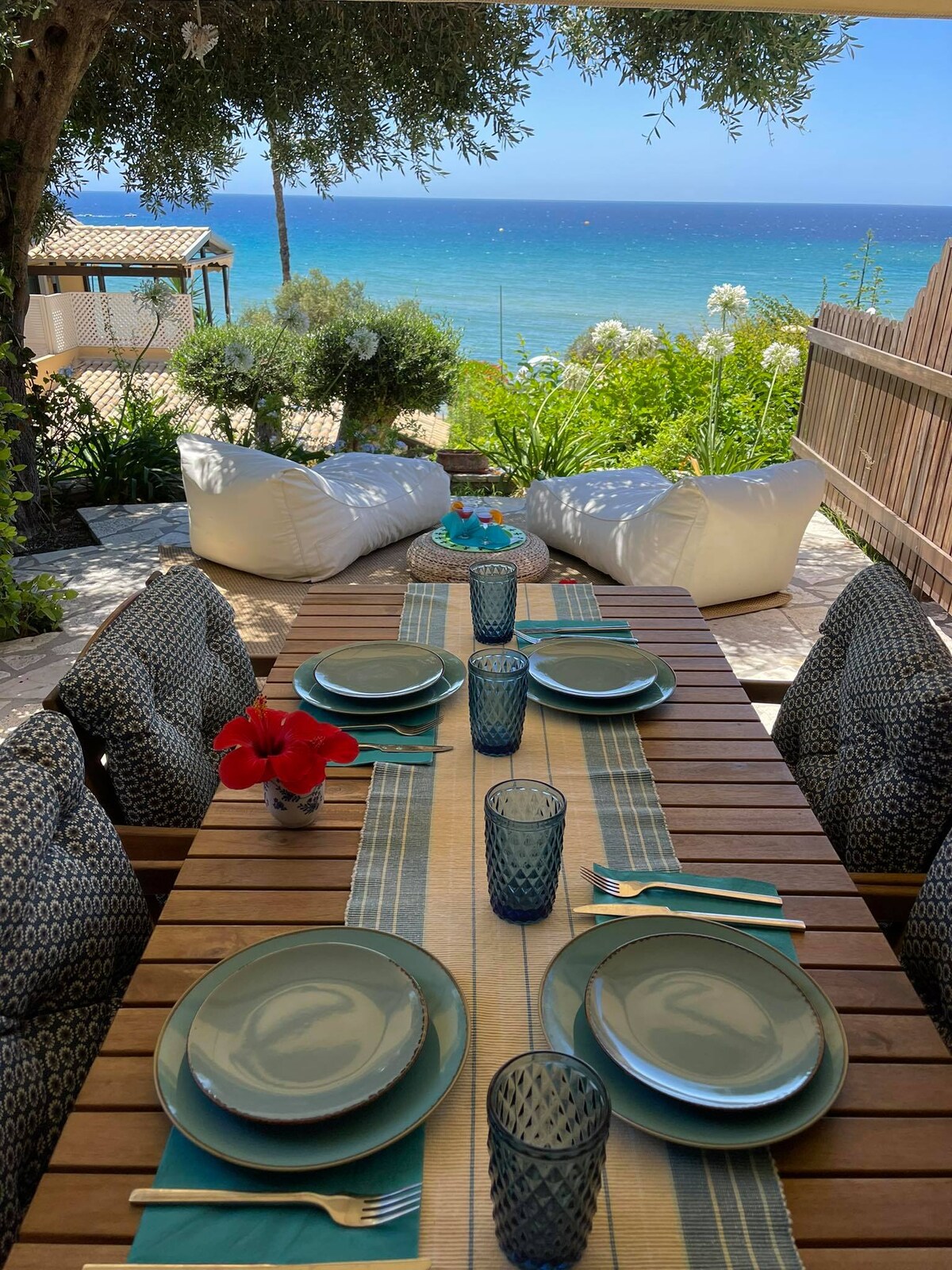 Our fully renovated with modern style apartment with its small yard is set over one of the most beautiful beaches of Corfu island. It is ideal for couples looking for a great time in a great area. The fully equipped modern open kitchen allows you to cook and enjoy your meals overlooking the sea. Comfortable sofa, big LCD smart flat screen and cable satellite TV, fully AC, sofa, Cocomat double bed. Shower bathroom. Starling satellite WiFi is also installed in the apartment !