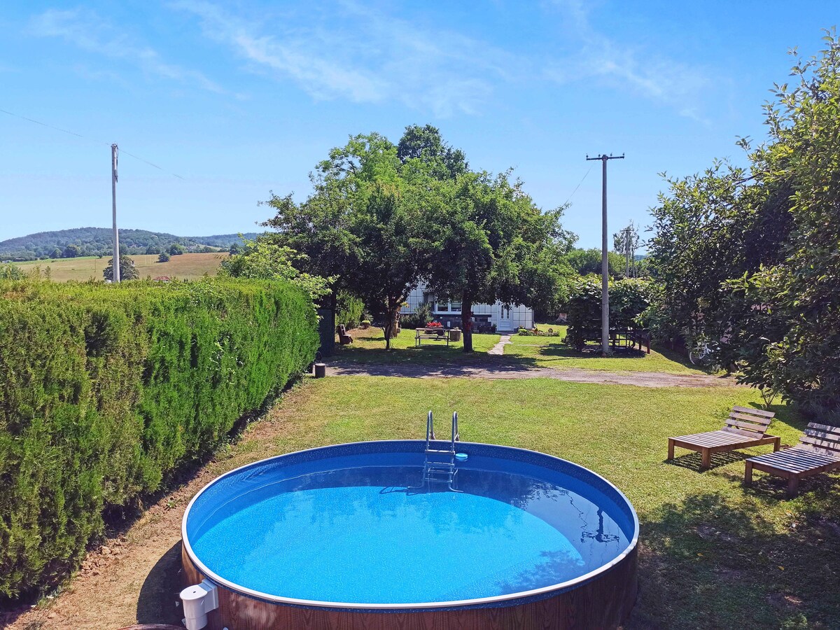 The cottage is built with natural materials, following sustainable principles, and is part of a traditional rural household, close to homemade food and farm animals. There’s no kitchen, but we offer meals from our menu that you can choose as needed. It features a TV, Wi-Fi, and a large desk for two. A special treat is an afternoon rest in the built-in tub overlooking the forest.
